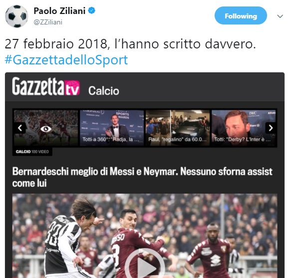 Paolo Ziliani ha commentato con un ironico tweet un articolo de La Gazzetta dello Sport che definisce Bernardeschi 'meglio di Messi e Neymar' per il numero di assist. "L'hanno scritto davvero", il cinguettio del giornalista, visibile in basso.