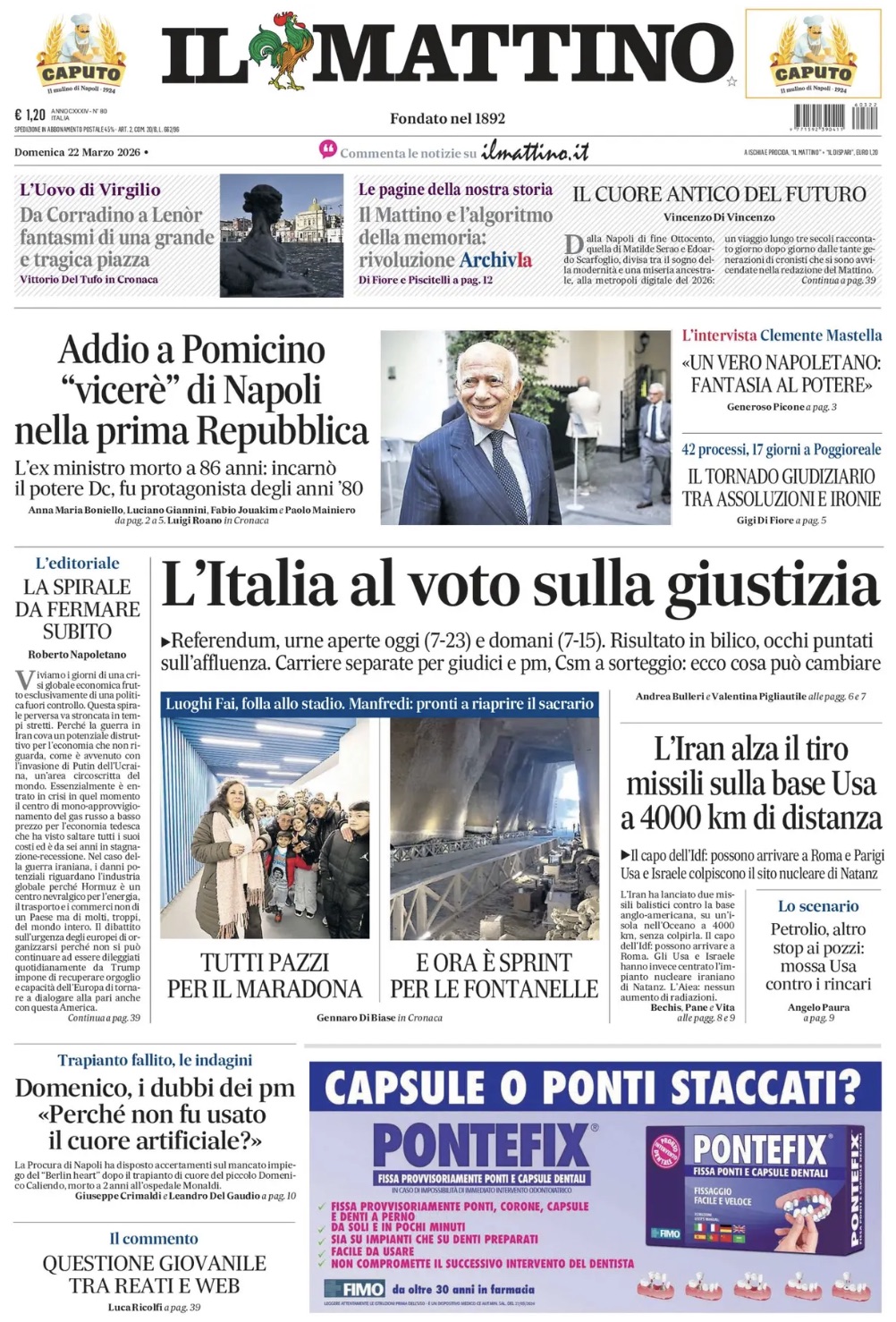 "Tutti pazzi per il Maradona", scrive così in prima pagina Il Mattino nell'edizione odierna, parlando dell'enorme afflusso di visitatori allo Stadio Diego Armando Maradona, aperto per le Giornate FAI Primavera. Il sommario: "Luoghi Fai, folla allo stadio. Manfredi: pronti a riaprire il sacrario". Di seguito la prima pagina integrale.