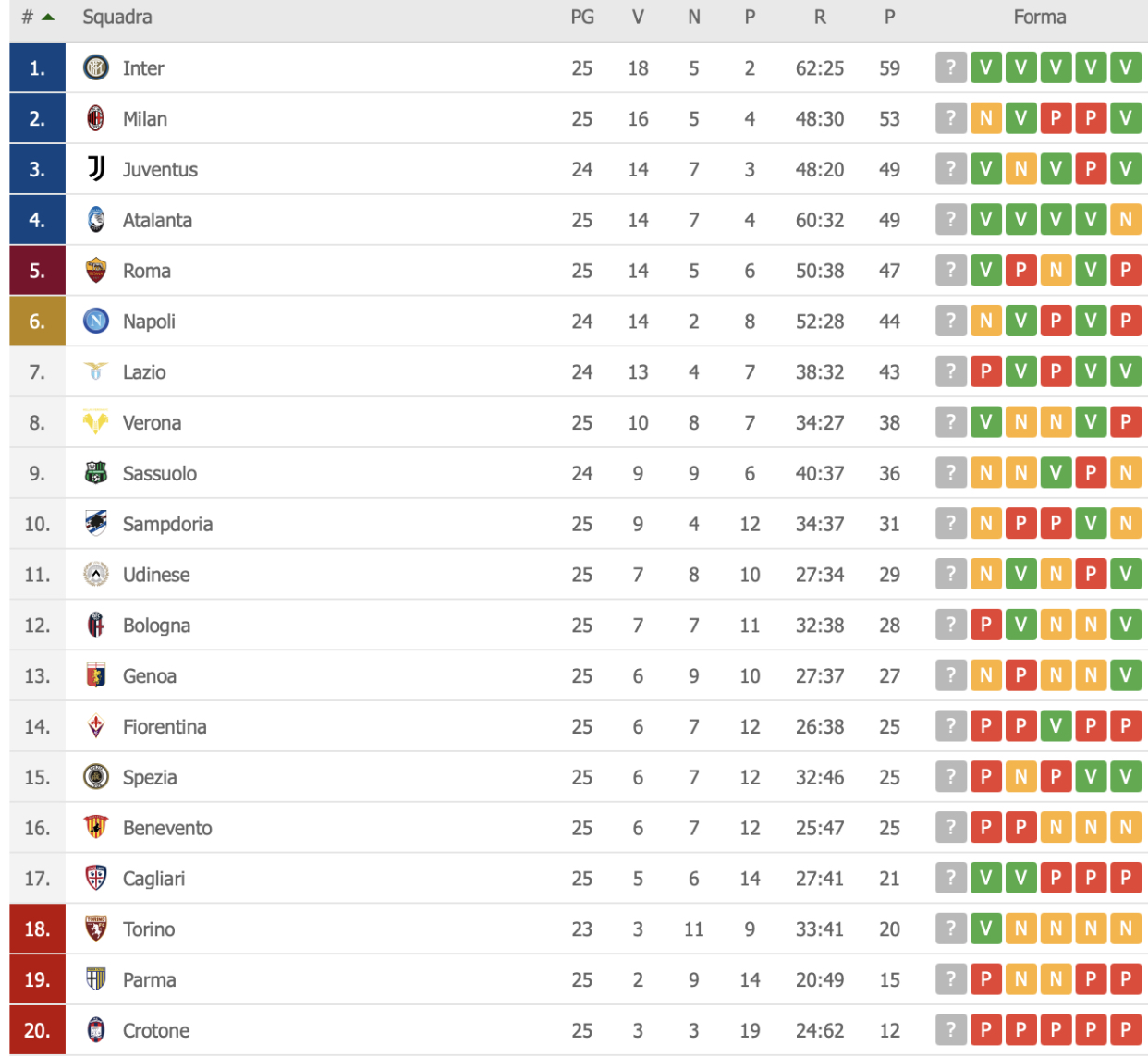 CLASSIFICA - L’Inter vince e allunga sul Milan: Napoli sesto a -5 dalla Champions