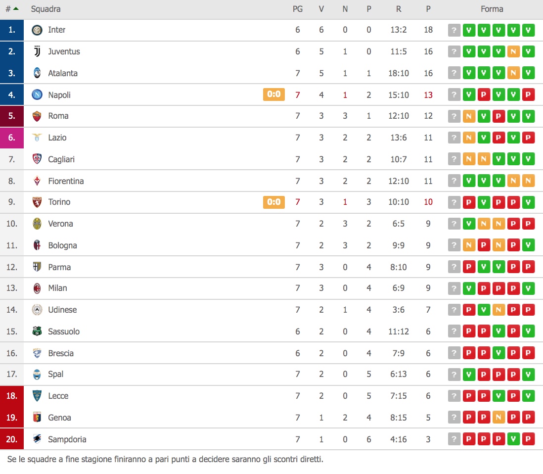 Il Napoli che guadagna un punto dalla trasferta di Torino e sale a quota 13 in classifica. Con questo risultato il Napoli si piazza al 4° posto finendo a -3 dall'Atalanta che nel pomeriggio aveva battuto il Lecce.