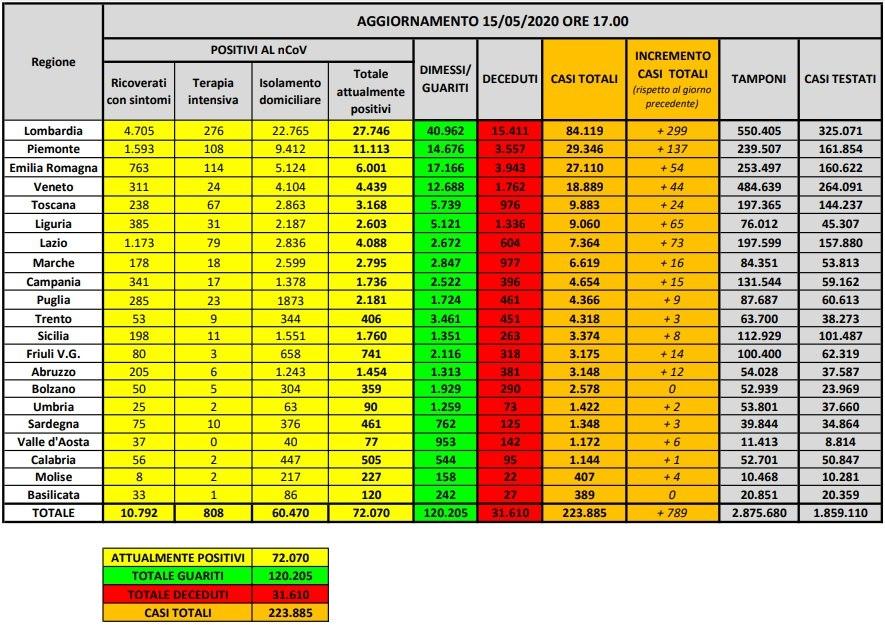 Nelle ultime 24 ore sono stati individuati su tutto il territorio nazionale 789 nuovi positivi al coronavirus: 299 nella sola Regione Lombardia, 137 in Piemonte.