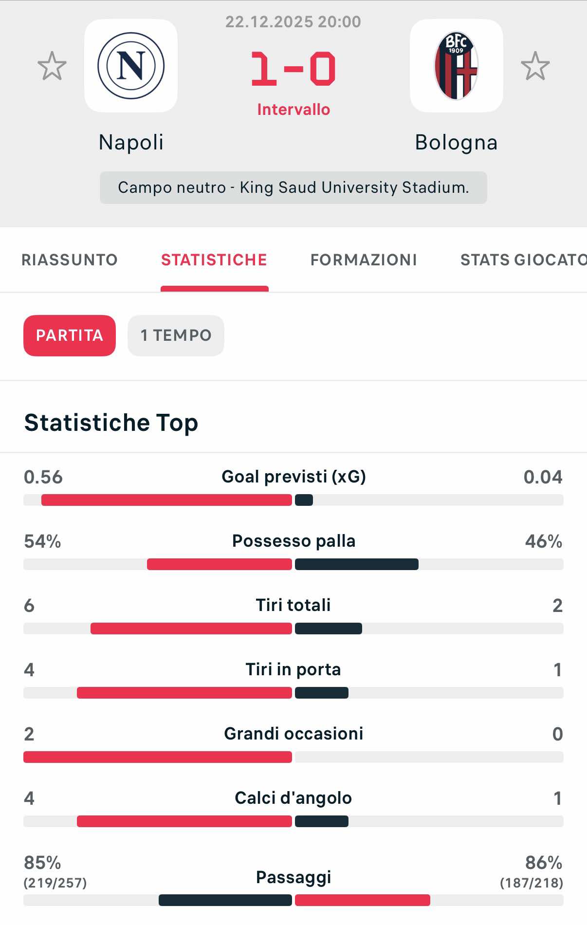 Il Napoli chiude il primo tempo in vantaggio contro il Bologna e lo fa con grande merito. Gli azzurri di Antonio Conte stanno dominando la partita sul piano del gioco e le statistiche lo testimoniano: solo 0.04xG concessi ai felsinei a fronte dei 0.54xG creati da Neres e compagni, 6 tiri di cui 4 in porta mentre i rossoblu sono arrivati solo 2 volte alla conclusione (una nello specchio). Leggermente a favore anche il possesso palla, 54% a 46.