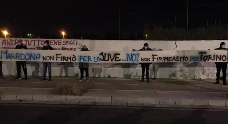 FOTO - Lo striscione degli operai della Meridbulloni: "Maradona non firmò per la Juve..."