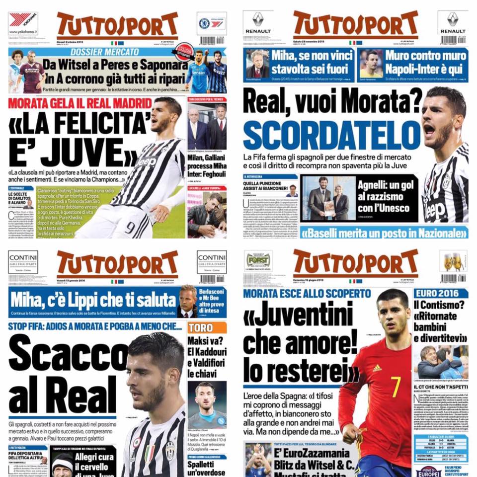 Alvaro Morata ha lasciato ufficialmente la Juventus per tornare al Real Madrid e si scatena l'ironia del web: circola da qualche ora sui social un'immagine con una serie di copertine di Tuttosport delle ultime settimane dedicate allo spagnolo. Il quotidiano torinese era sicuro della permanenza della punta, ma alla fine è finita diversamente...