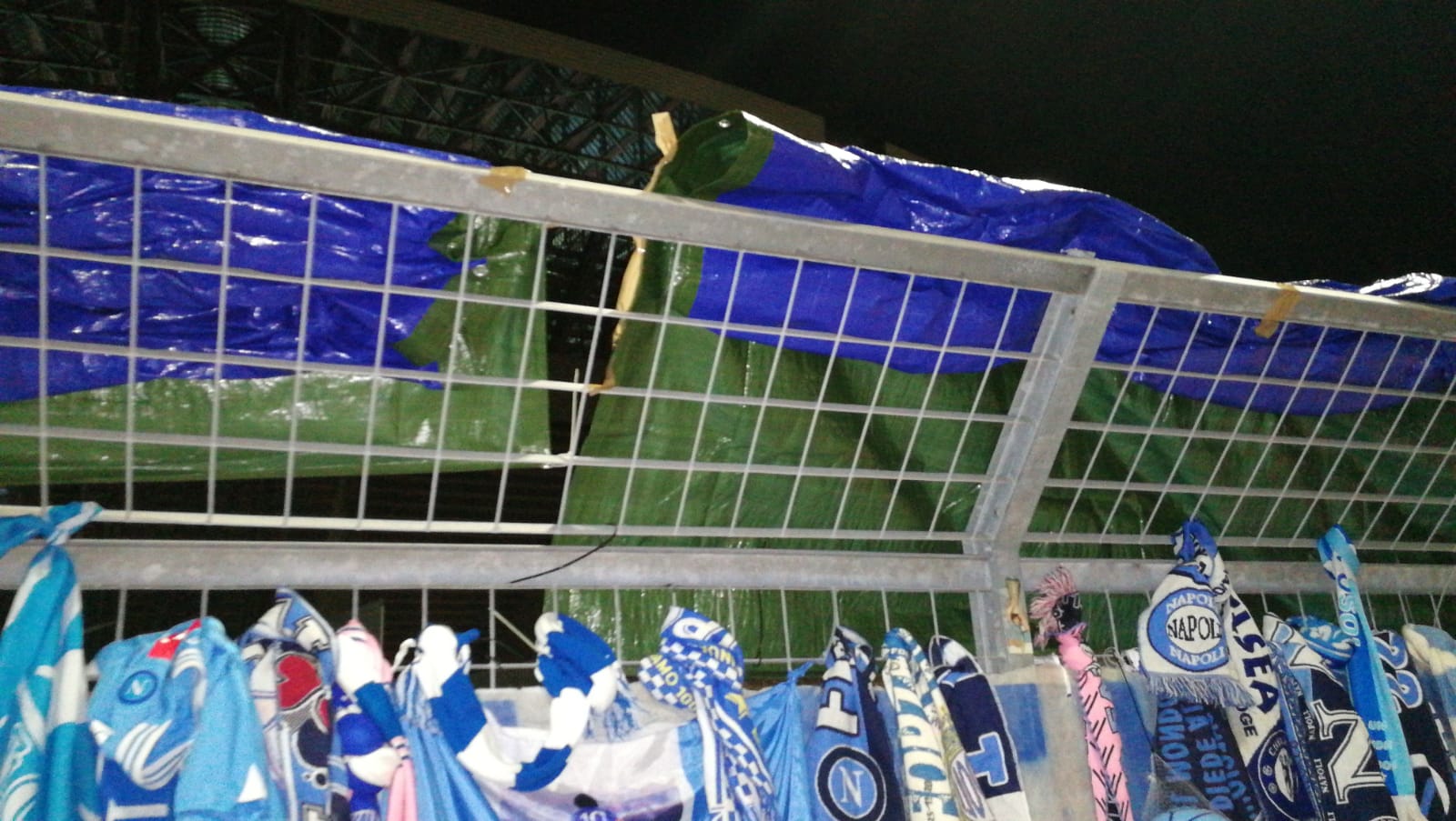 A Napoli piove e all'esterno dello stadio San Paolo, prossimamente Diego Armando Maradona, sono stati messi dei teloni sulla rete di recinzione per coprire i cimeli che i tifosi hanno posto per omaggiare il fuoriclasse argentino. Già in mattinata il Comune aveva provveduto a rimuovere dall'asfalto sciarpe, maglie e tutto il materiale che poteva essere danneggiato con la pioggia. Di seguito la foto.