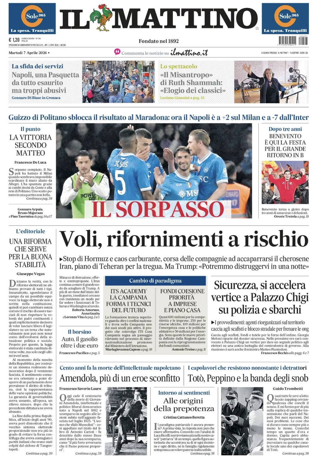 "Il sorpasso", apre così in prima pagina Il Mattino nell'edizione odierna, commentando alla vittoria degli azzurri di Conte che hanno scavalcato i rossoneri di Allegri in classifica. Il sommario: "Guizzo di Politano sblocca il risultato al Maradona: ora il Napoli è a +2 sul Milan e a -7 dall'Inter'". Di seguito la prima pagina integrale.