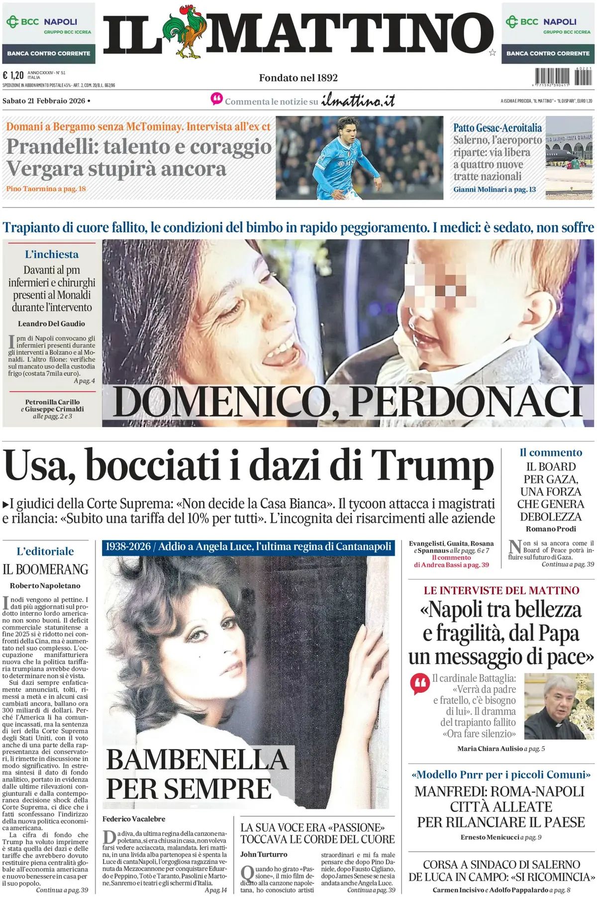 La prima pagina di Il Mattino mette in evidenza l’assenza di McTominay per la trasferta di Bergamo, segnale delle difficoltà di gestione della rosa in una fase delicata della stagione. Taglio alto dedicato all'intervista a Prandelli, ex allenatore, che sottolinea invece la fiducia nei giovani come Vergara, simbolo di un Napoli che guarda al futuro. Di seguito la prima pagina integrale