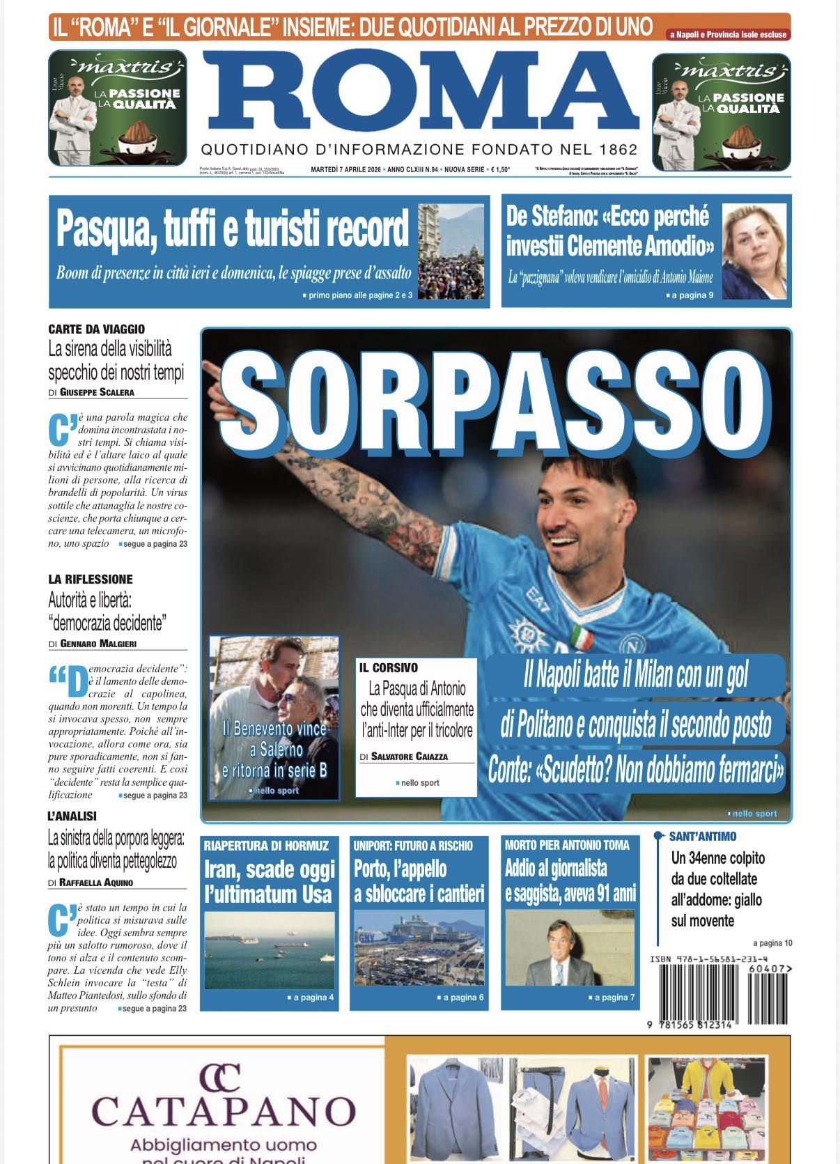 "Sorpasso", titola così il quotidiano Il Roma nella prima pagina odierna, in riferimento alla vittoria degli azzurri che hanno scavalcato i rossoneri di Allegri in classifica. Il sommario: "Il Napoli batte il Milan con un gol di Politano e conquista il secondo posto. Conte: 'Scudetto? Non dobbiamo fermarci'". Di seguito la prima pagina integrale.