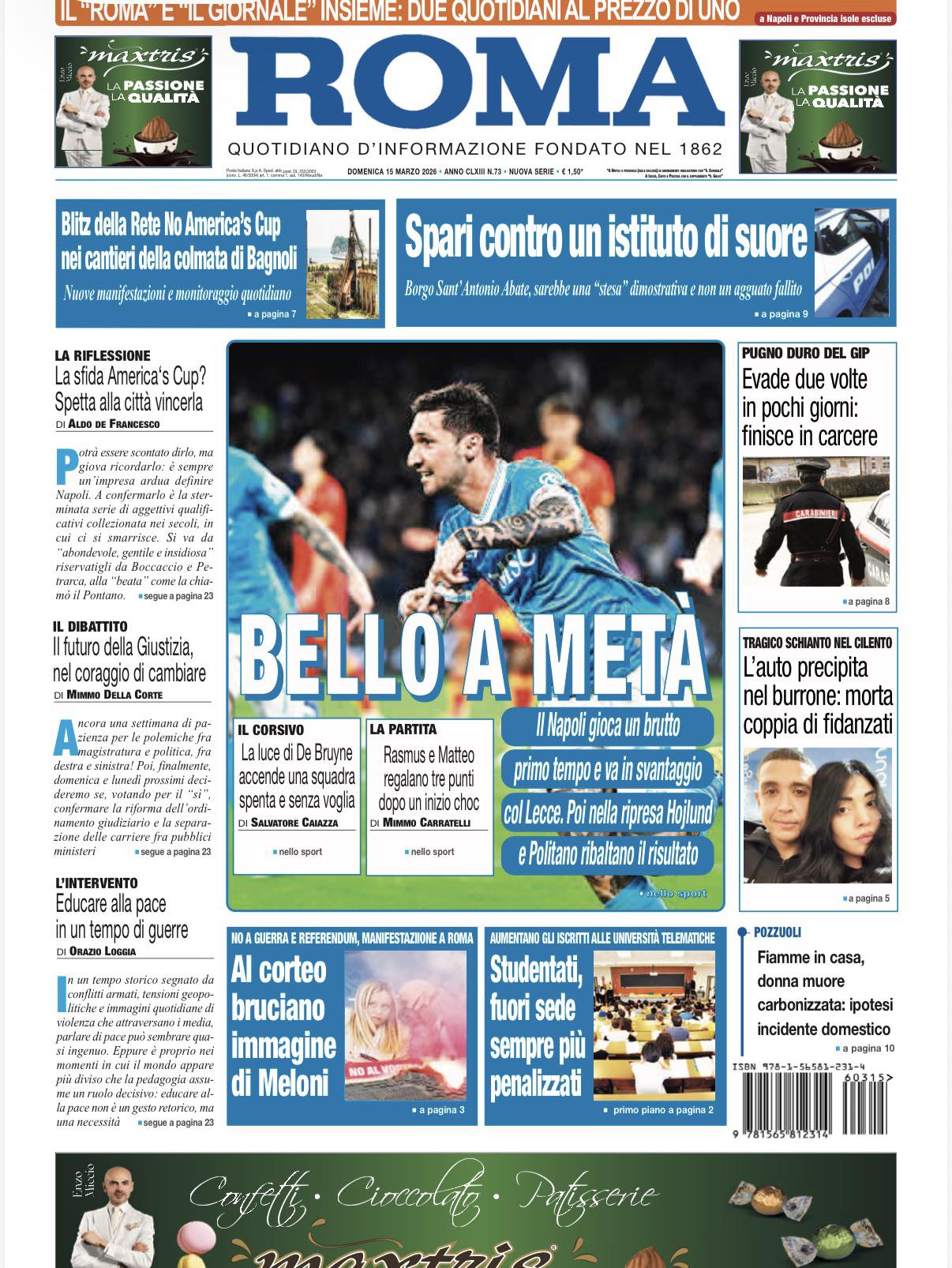 "Bello a metà", apre così in prima pagina il quotidiano Il Roma nell'edizione odierna, commentando la prestazione degli azzurri di Antonio Conte contro i salentini di Eusebio Di Francesco. Il sommario: "Il Napoli gioca un brutto primo tempo e va in svantaggio col Lecce. Poi nella ripresa Hojlund e Politano ribaltano il risultato". Di seguito la prima pagina integrale.
