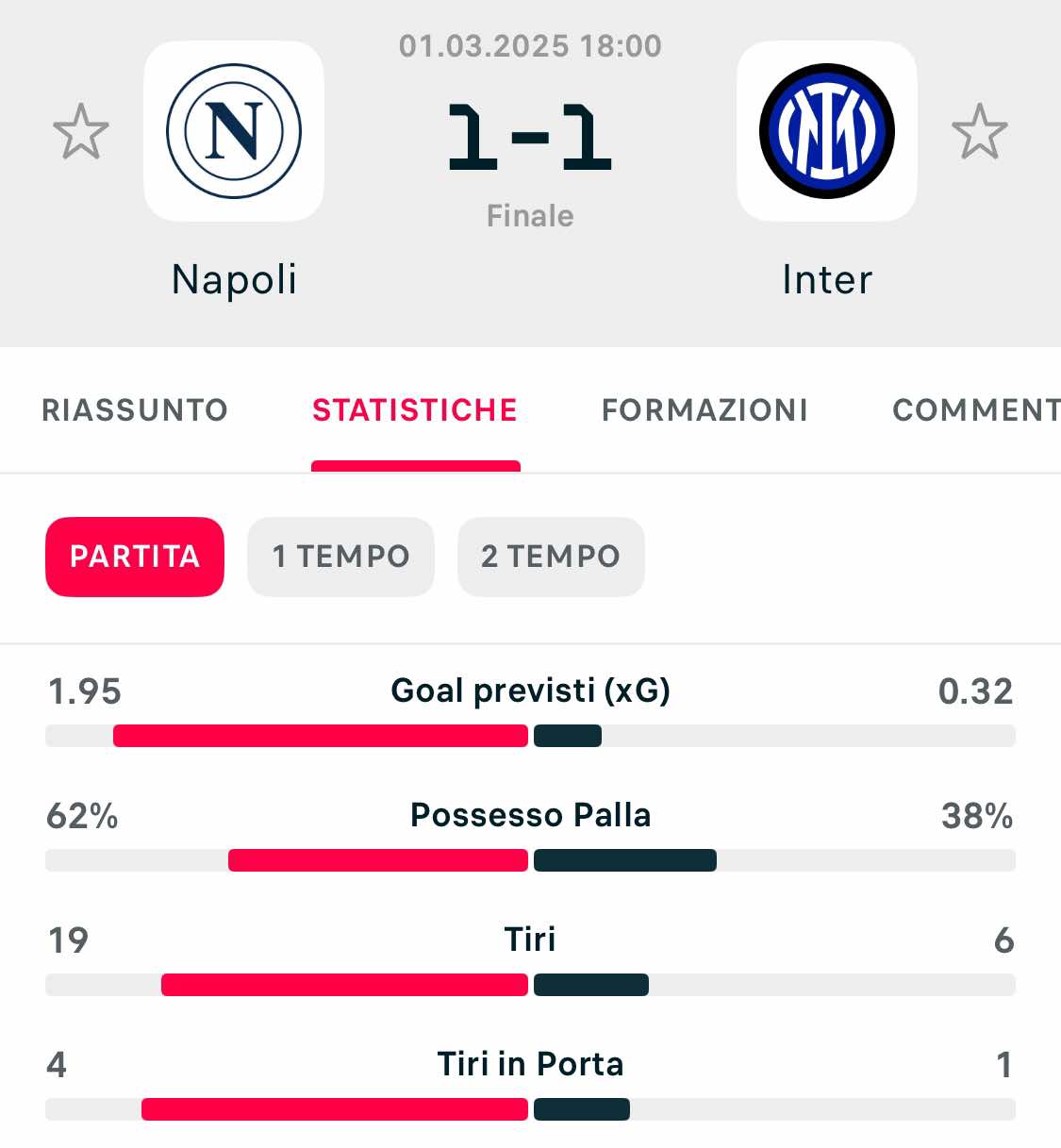 Al Maradona finisce 1-1 tra Napoli e Inter, in classifica quindi i nerazzurri restano a +1. La gara però ha detto tutt'altro: la squadra di Conte dopo essere passata in svantaggio su un episodio, domina quelli di Inzaghi ed il punto va assolutamente stretto. Le statistiche del match dicono infatti 19 tiri (4 in porta) a 6 (uno in porta) a favore del Napoli, 1.95xG a 0.32xG per gli azzurri e ben il 62% di possesso palla.