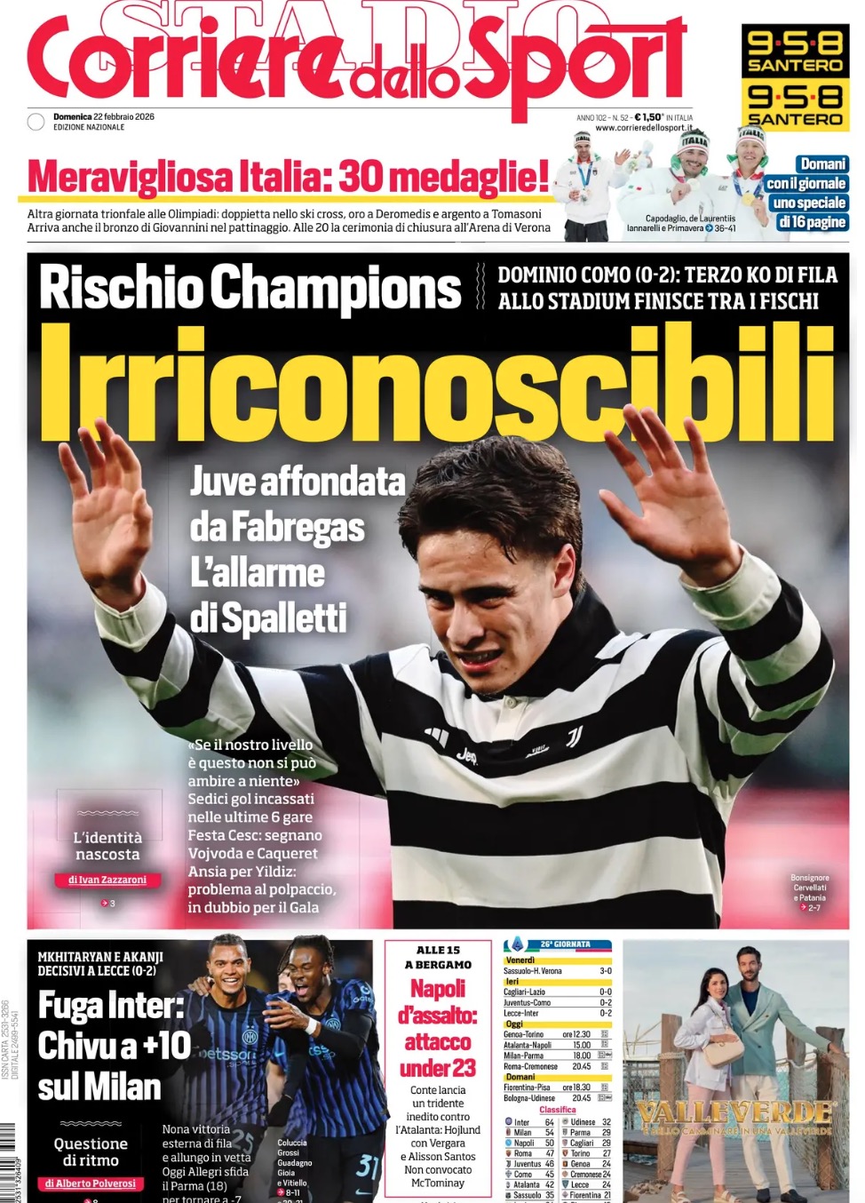 Il titolone di apertura del Corriere dello Sport è impietoso: "Irriconoscibili", con il sottotitolo che recita "Rischio Champions". La Juventus esce dallo Stadium tra i fischi del pubblico, travolta 0-2 dal Como di Fabregas. Spalletti non le manda a dire: "Se il nostro livello è questo non si può ambire a niente", con la squadra che ha incassato 16 gol nelle ultime sei partite.