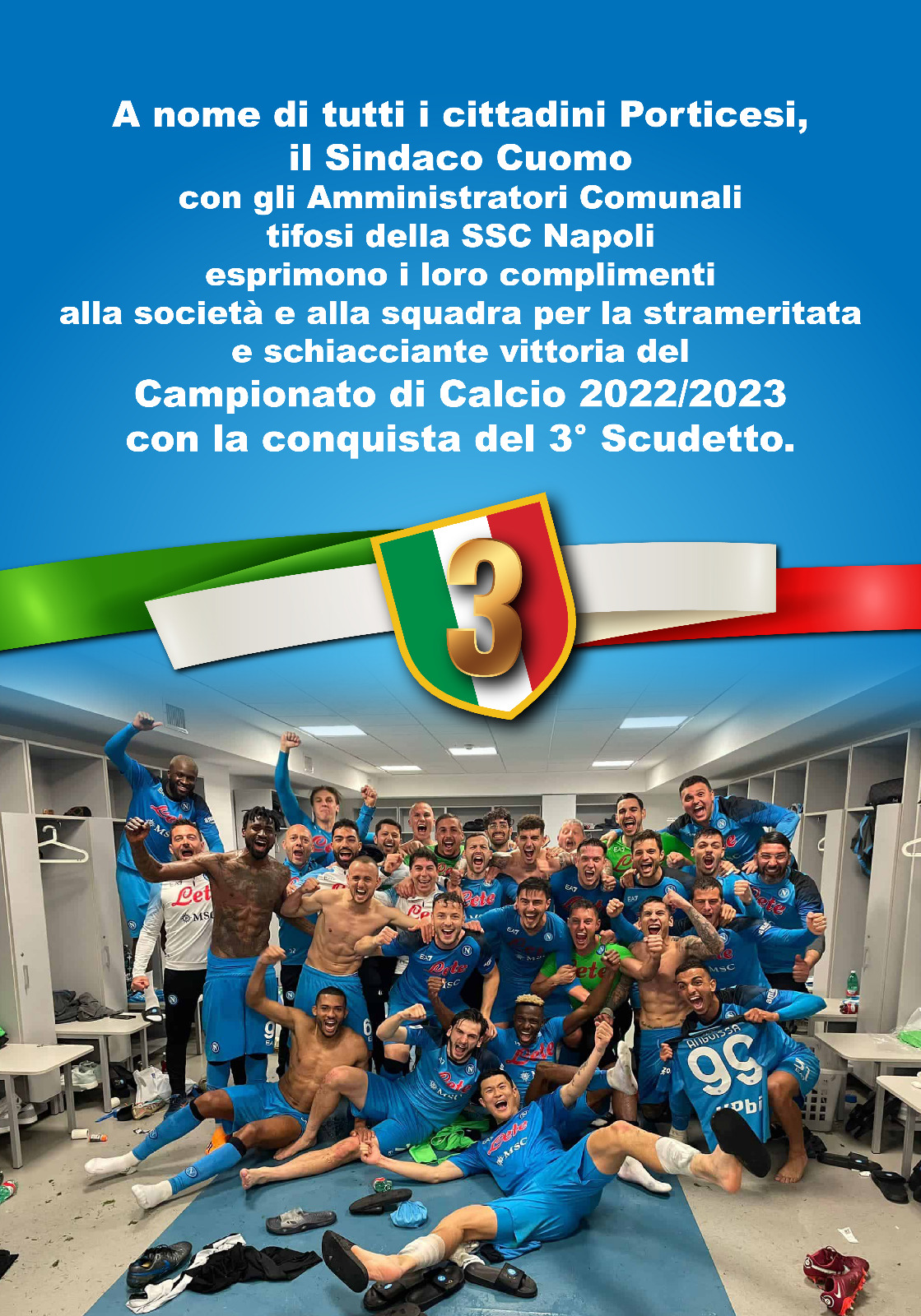 A Portici ci sono manifesti affissi in città, i cittadini, il sindaco Cuomo, gli amministratori tutti tifosi del Napoli esprimono i complimenti al Napoli per il trionfo con lo Scudetto. La curiosità è che c'è stata autotassazione da parte degli amministratori e a pagare è stato anche un consigliere ma di fede juventina. Doppia beffa per lui. Una iniziativa goliardica che ha divertito tutti i partecipanti. La foto che testimonia l'avvenuta partecipazione con la quota simbolica: