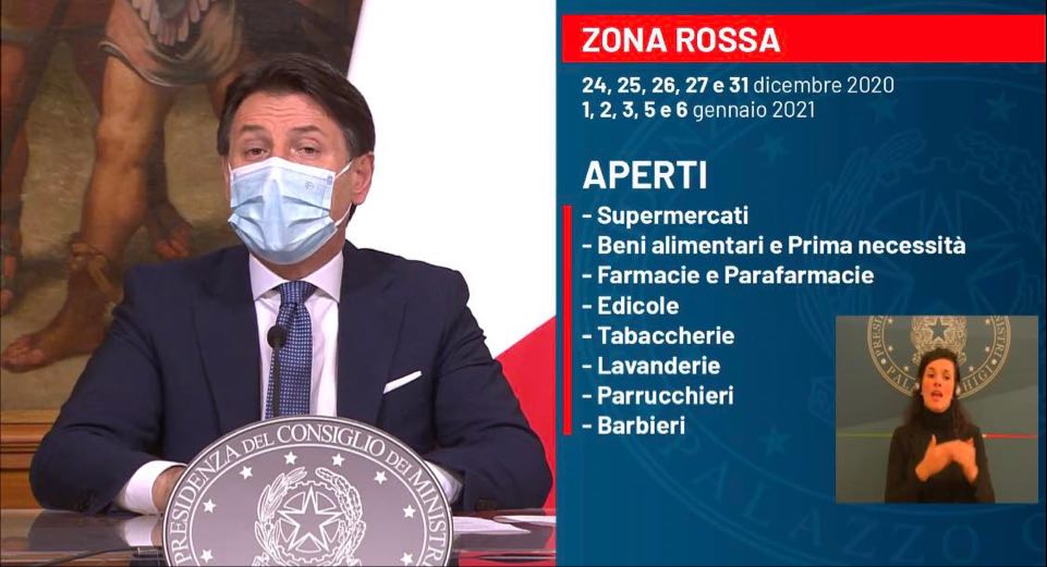 Il Presidente del Consiglio Giuseppe Conte, nel corso della conferenza stampa dal Viminale, ha spiegato quali attività commerciale saranno chiuse e quali aperte durante la zona rossa in vigore nei giorni festivi e prefestivi, dal 24 dicembre al 6 gennaio : "Con questa zona rossa ci sarà la chiusura degli esercizi commerciali, dei centri estetici, dei bar, dei ristoranti tranne l'asporto fino alle ore 22 e le consegne a domicilio. Restano aperti supermercati, negozi di beni alimentari, di prima necessità. edicole, tabaccherie, farmacie, parafarmacie, lavanderie, parrucchieri, barbieri. Le chiese e i luoghi di culto saranno aperti fino alle ore 22".