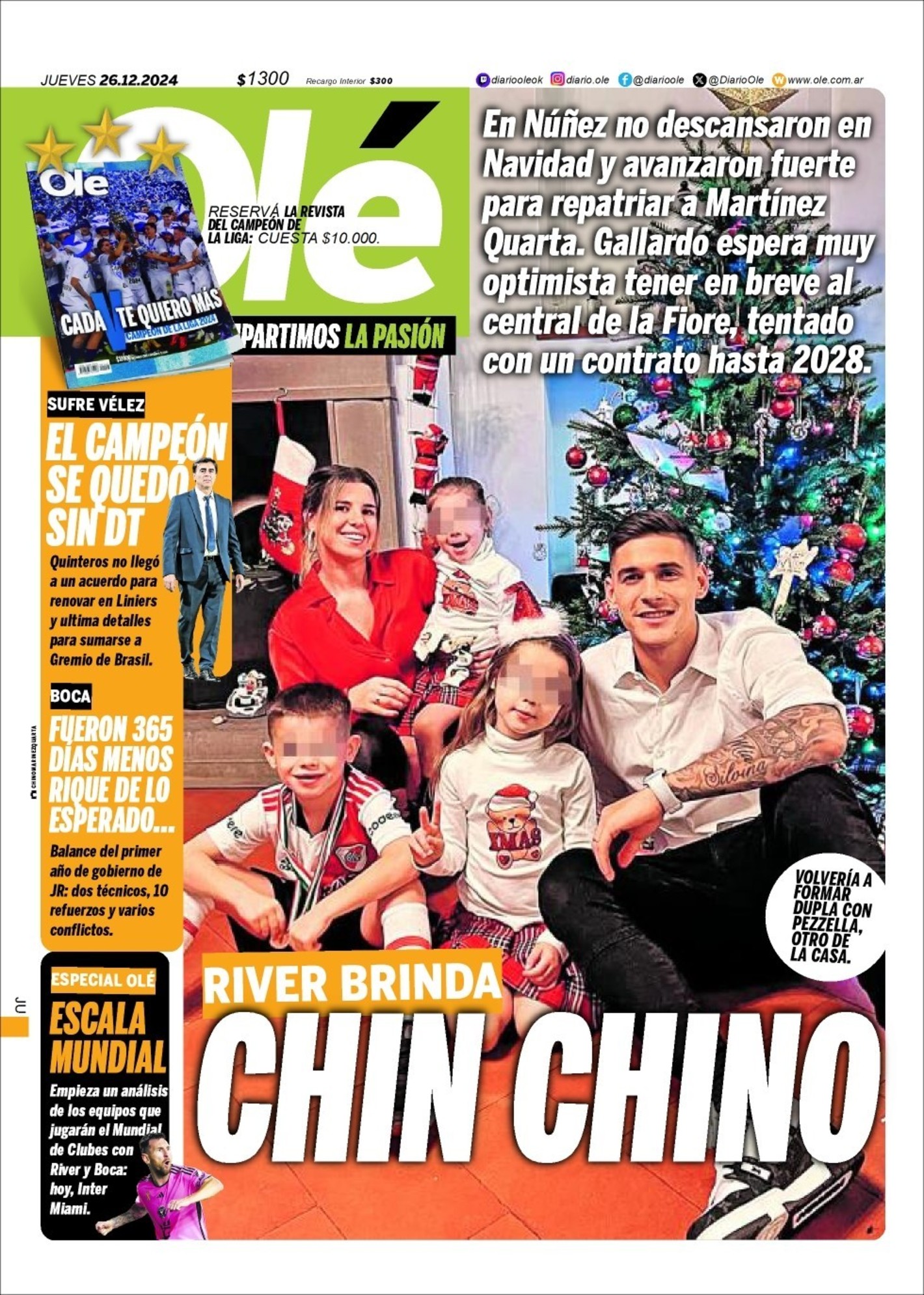 Intanto in Argentina si parla molto di questo possibile affare, che per il River Plate sarebbe un grande colpo di mercato visto che Quarta è attualmente ancora nel giro della Nazionale di Scaloni. Il quotidiano argentino Olè, nella sua edizione odierna, titola a tutta pagina: "Il River brinda: chin Chino" alludendo ovviamente al soprannome del difensore classe 1996. Poco sopra si può leggere come il club argentino non abbia passato il Natale a festeggiare ma bensì a trattare per il "rimpatrio" di Quarta, con il tecnico Gallardo che spera di avere a disposizione il giocatore il prima possibile.