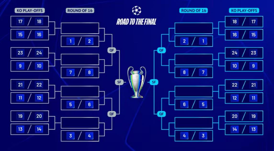 Le squadre che terminano la fase campionato tra il 9° e il 16° posto saranno teste di serie del primo sorteggio della fase a eliminazione diretta e affronteranno una squadra classificata dal 17° al 24° posto. La squadra testa di serie, in linea di principio, giocherà il ritorno in casa. I potenziali avversari sono inoltre predefiniti dagli accoppiamenti delle posizioni finali nella fase campionato. Ad esempio, le squadre che si classificano al 9° e al 10° posto affronteranno le squadre che si sono classificate al 23° o 24° posto; le squadre che si classificano all'11° o al 12° posto saranno sorteggiate contro le squadre classificate al 21° o al 22° posto e così via.