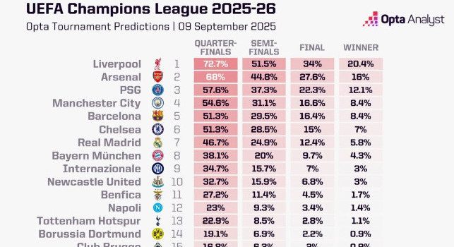 Chi vincerà la prossima UEFA Champions League? Prova a dare una risposta Opta, noto istituto internazionale di analisi dei dati sportivi, che attraverso il suo “super-computer” ha elaborato le percentuali di successo delle principali contendenti. Poche le speranze per il Napoli: secondi i calcoli gli azzurri hanno appena l’1,4% di possibilità di alzare la coppa, il 3,4% di arrivare in finale, il 9,3% di raggiungere la semifinale e circa il 23% di accedere ai quarti.