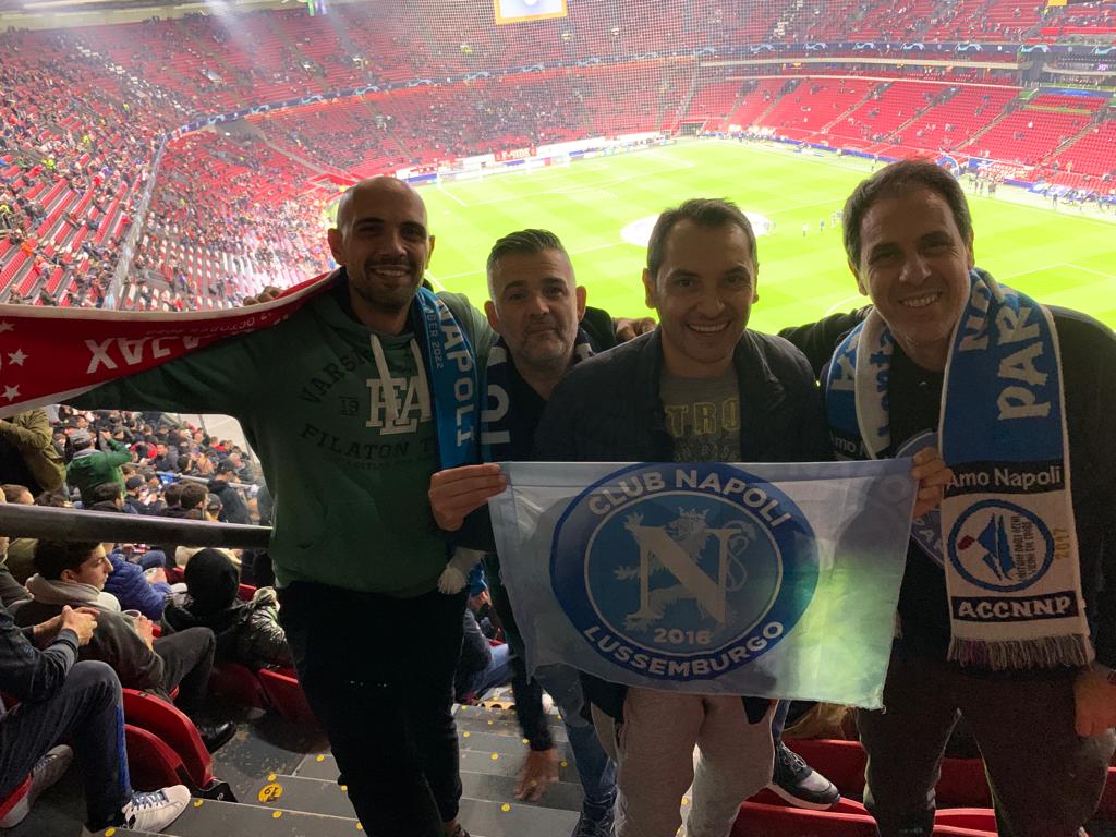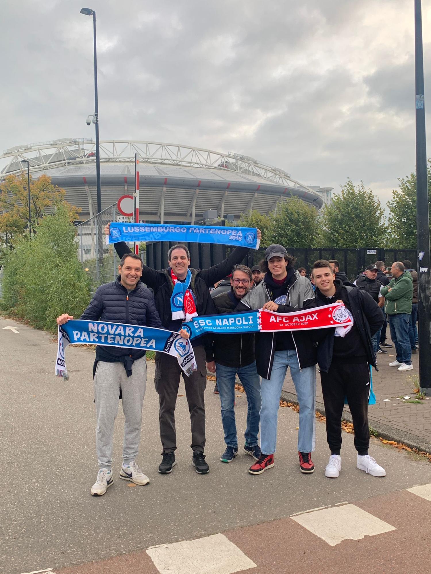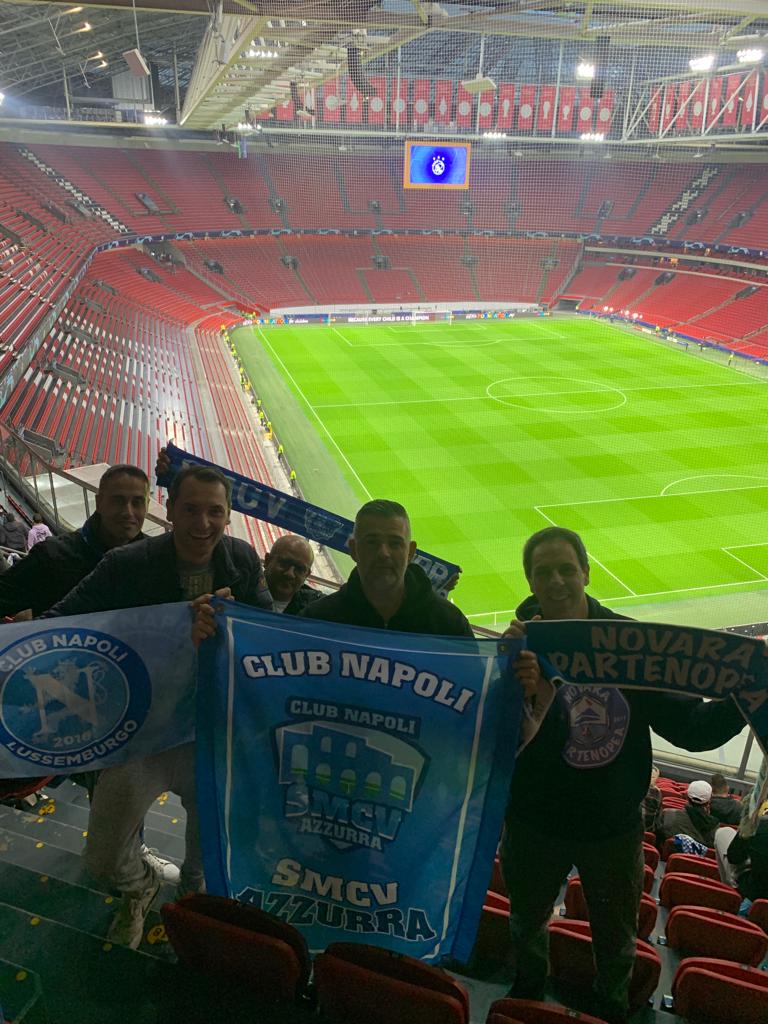 Grande serata per i club Napoli nel mondo. Tante sigle presenti ieri alla Cruijff Arena, dopo aver sostenuto viaggi faticosi e tanti sacrifici arriva la serata magica da ricordare per sempre per i tifosi azzurri. Presenti tra gli altri: Napoli Club Imola, Novara Partenopea, Club Napoli Monaco di Baviera, Club Napoli Cava dei Tirreni, Club Napoli Santa Maria Capua Vetere, Club Napoli Lussemburgo, Bergamo Azzurra. Di seguito le immagini dei club dall’impianto di Amsterdam dopo la vittoria storica del Napoli contro l’Ajax.