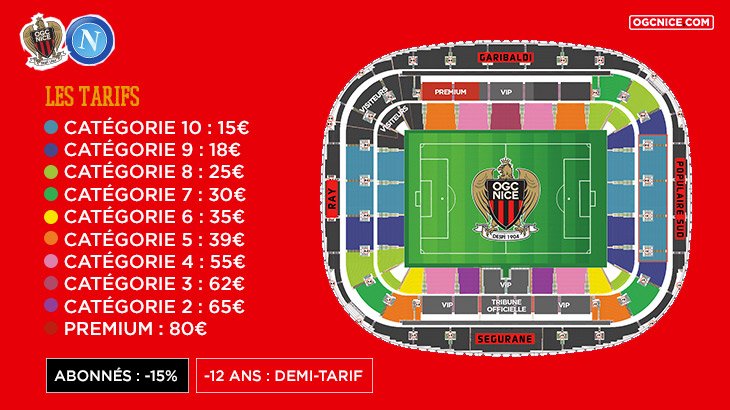 Sarà Nizza-Napoli il 22 agosto, e per la gara di ritorno la squadra francese ha già pubblicato i prezzi dei tagliandi per il match che si giocherà all'Allianz Riviera: dai 15 euro di prezzo minimo per le curve, fino agli 80 euro per la tribuna Premium. Di seguito l'immagine pubblicata dal club francese con tutti i dettagli sui prezzi.