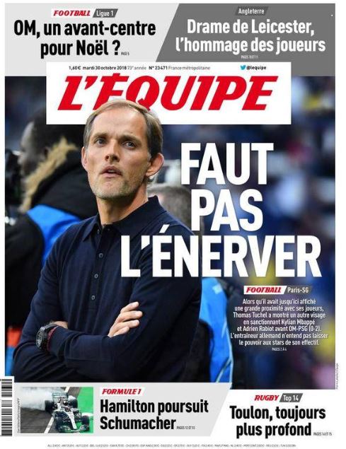 L'Equipe di questa mattina dà un consiglio a Thomas Tuchel, tecnico del PSG, titolando: "Non ti arrabbiare". Il riferimento è alle sanzioni che l'allenatore vuole dare a Mbappé e Rabiot dopo i ritardi in seguito alla riunione tecnica post vittoria contro il Marsiglia. Il tedesco non ha nessuna intenzione di dare permessi speciali alle sue stelle.