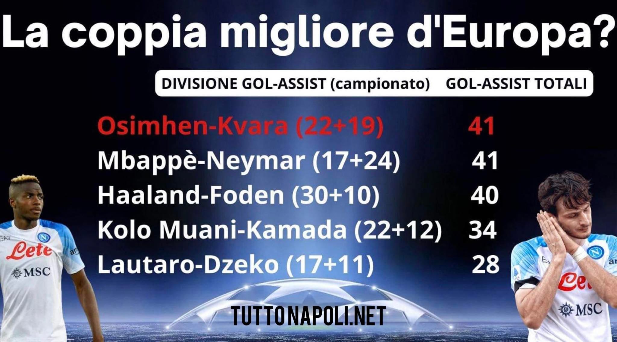Per i numeri Victor Osimhen e Khvicha Kvaratskhelia sono la miglior coppia d'Europa! Con le due splendide reti contro il Sassuolo i due attaccanti del Napoli hanno raggiunto rispettivamente quota 18 e 10 gol in campionato. Per Osimhen anche 4 assist, mentre per Kvara sfiora la doppia cifra a 9. Sommando le reti e gli assist dei due azzurri (22+19) si raggiunge 41, lo stesso risultato ottenuto dal duo del PSG Mbappé-Neymar (17+24) al primo posto delle migliori coppie d'Europa delle squadre di Champions.