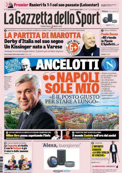 "Che cosa è il calcio? Dovrebbe essere un gioco, ma per questo è un diversivo. A Napoli rappresenta anche una rivalsa, una sorta di riscatto dal senso di abbandono che questa città ha legittimamente introiettato nei secoli. Per me rimane un gioco. Bello, emozionante. Ancora mi diverto, ancora lo faccio con passione. Sento tanta gente del calcio dire che non riesce a dormire per la pressione. Io dormo sempre". E' il manifesto di Carlo Ancelotti lasciato in una lunga intervista alla Gazzetta dello Sport.