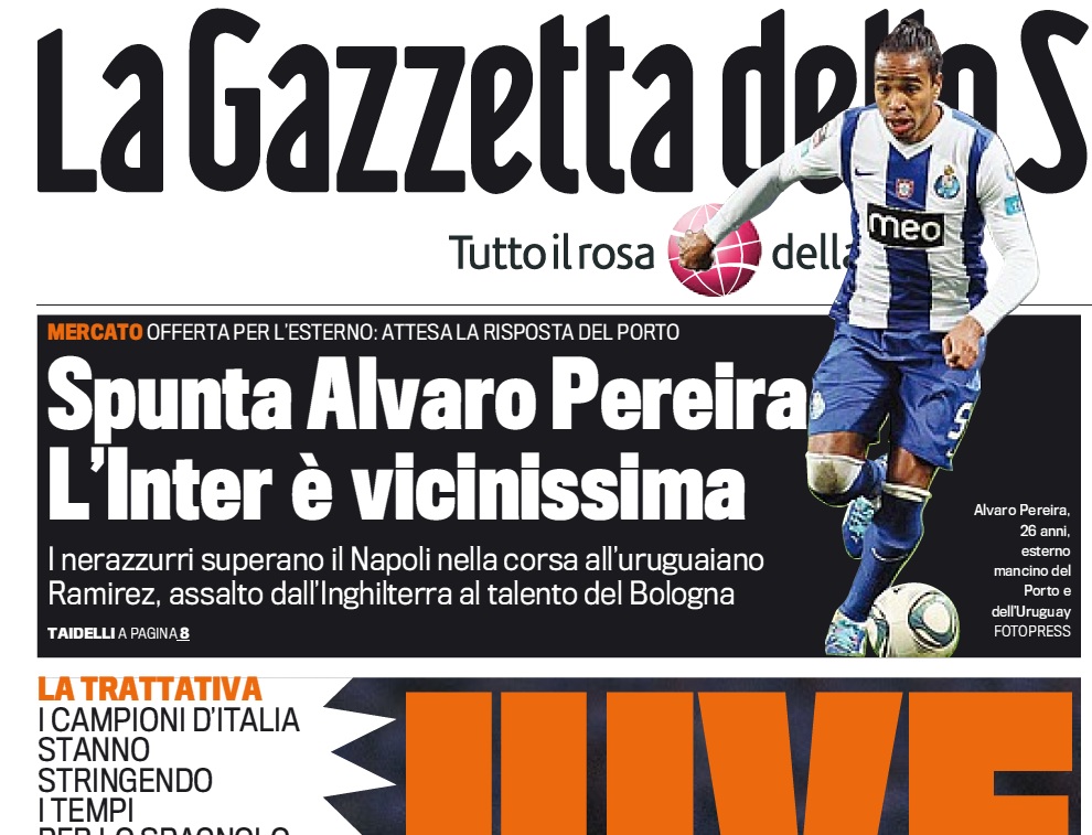 Napoli beffato nella corsa ad Alvaro Pereira. Ne è convinta la Gazzetta dello Sport che - nella sua prima pagina in uscita domani mattina - parla dell'Inter a un passo dal calciatore del Porto. Ecco la foto: