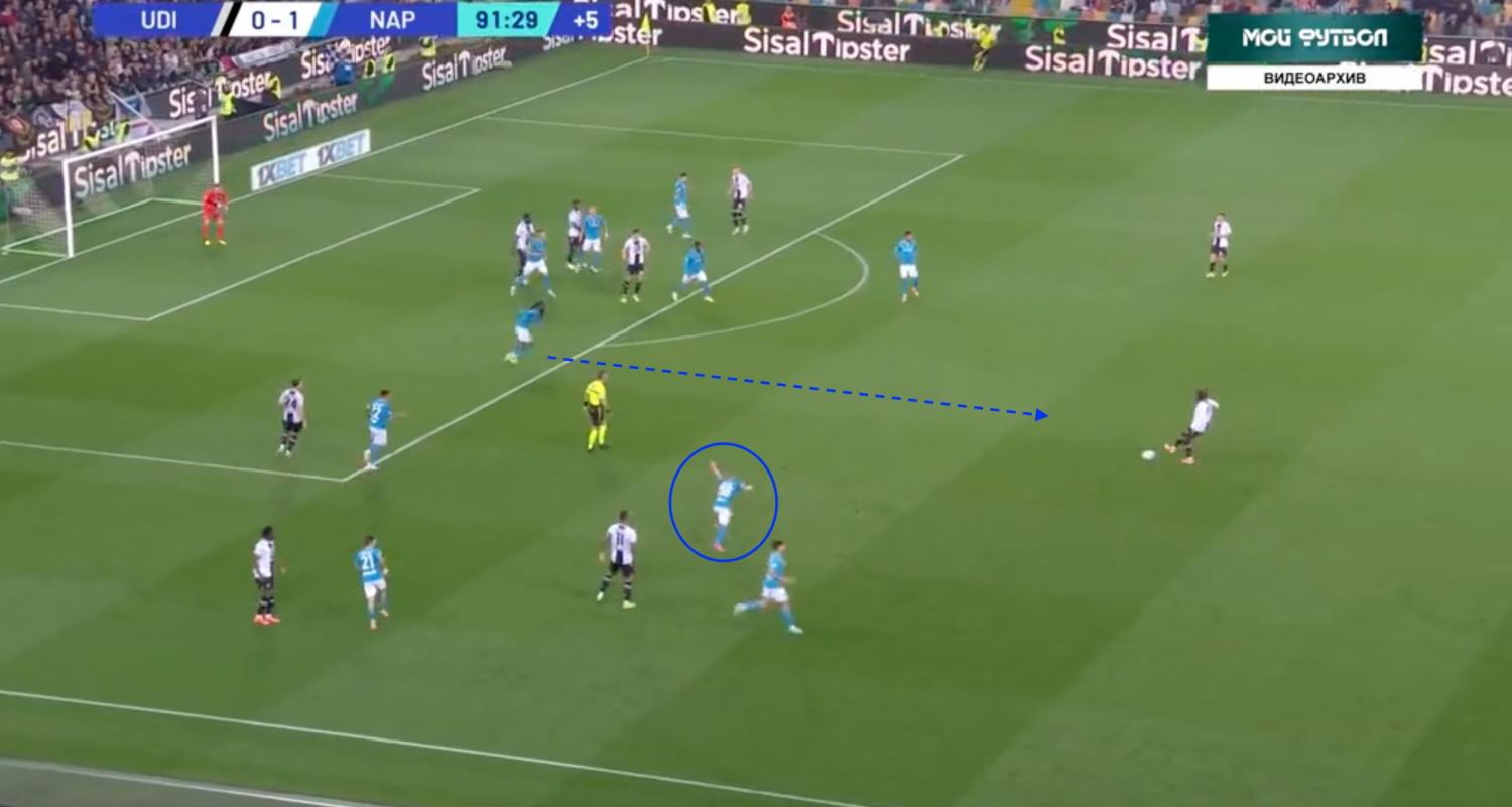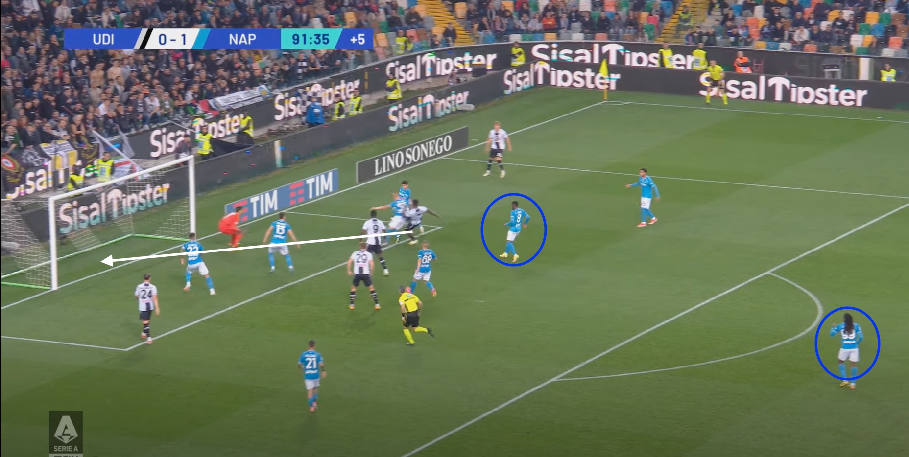 Lobotka s'infuria - Lo slovacco, come potete vedere, esce in pressione su Walace, ma sullo scarico Anguissa resta fermo e non sale permettendo il traversone in tranquillità (Traoré non farà nulla di diverso). Lobotka si sbraccia (foto in basso), richiamando il compagno a salire velocemente col movimento del braccio in avanti, ma Anguissa resta in una terra di nessuno, non indietreggiando per dare aiuto ai centrali (dall'inizio il Napoli è inferiorità 3 vs 2) e non dando pressione: ne viene fuori la palla scoperta che mette in difficoltà la linea difensiva, Olivera che fino all'ultimo non sa se stringere o allargarsi e le conseguenze che conosciamo. In questo senso, schiacciandosi tra i centrali, Cajuste invece sembrava avere ben altro atteggiamento (fino all'inspiegabile cambio). Nell'ultimo frame è paradossale vedere che al momento del gol è più vicino all'azione Lobotka, che partiva dalla rimessa laterale dall'altra parte, che Traoré (arriva lì a piccoli passi) ed Anguissa (rimasto totalmente fermo, alle spalle persino dell'arbitro che ha seguito l'azione). Con questo atteggiamento in Serie A non si batte neanche la squadra più in difficoltà del campionato.