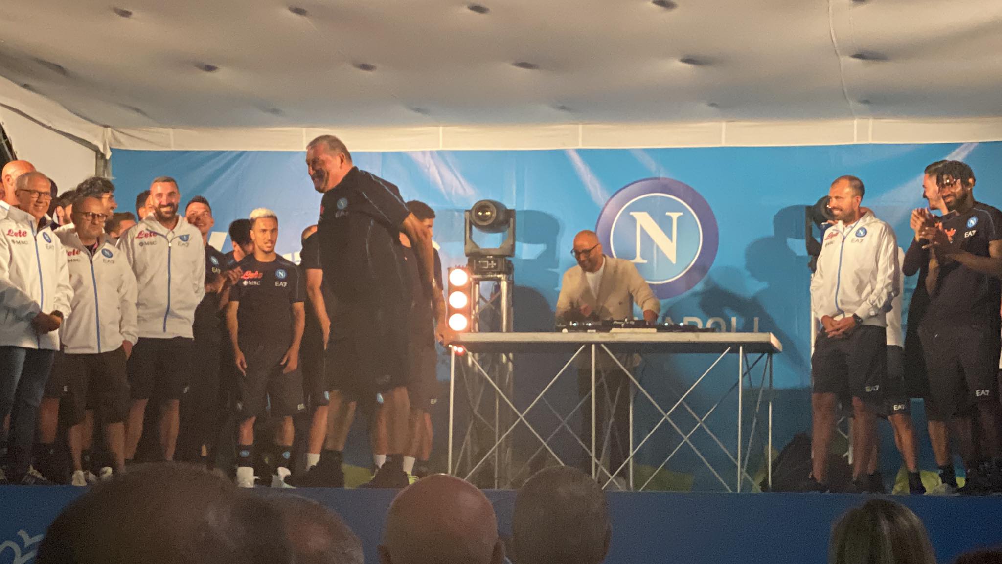 21:48 - Sale sul palco anche il magazziniere Starace e i tifosi intonano immediatamente un canto per Dries Mertens: "Olè olè olè olè, Ciro Ciro".