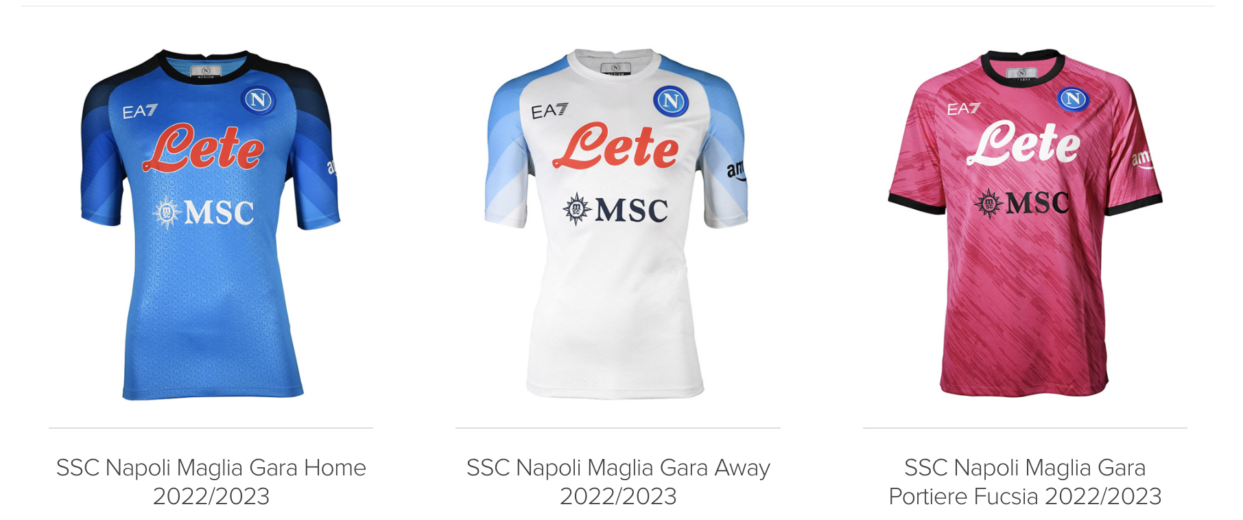 Prosegue anche per la stagione 2022-2023 la collaborazione di EA7 Emporio Armani con il Napoli. A seguito del rinnovato accordo con Aurelio De Laurentiis, proprietario e Presidente del Calcio Napoli, il marchio si conferma sponsor tecnico della squadra partenopea. (In allegato in basso le prime due maglie gara e la maglia per il portiere)