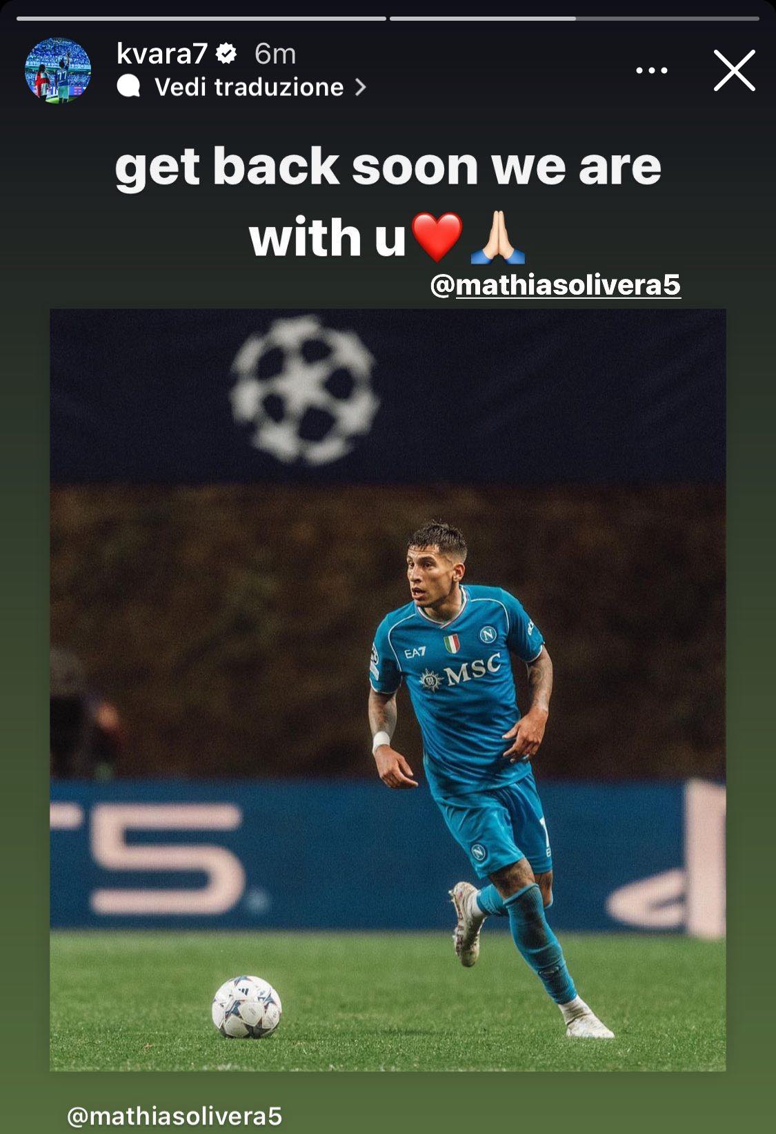 Dopo Juan Jesus, anche Khvicha Kvaratskhelia ha dedicato un post social allo sfortunato compagno di squadra Mathias Olivera, infortunatosi nel corso della vittoriosa trasferta di Bergamo. Dopo il match vinto 2-1 contro l'Atalanta, l'attaccante del Napoli ha postato su Instagram una foto del terzino uruguaiano, augurandogli un presto ritorno in campo: "Ritorna presto, siamo con te".