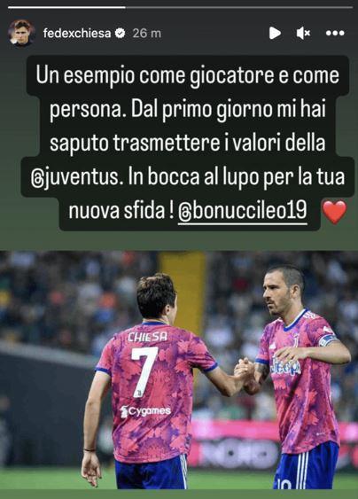 Federico Chiesa, attaccante delle Juventus, tramite una Instagram 'Story', ha voluto salutare Leonardo Bonucci che si è trasferito all'Union Berlino, prossimo avversario del Napoli in Champions League: "Un esempio come giocatore e come persona. Dal primo giorno mi hai saputo trasmettere i valori della Juventus. In bocca al lupo per la tua nuova sfida!".