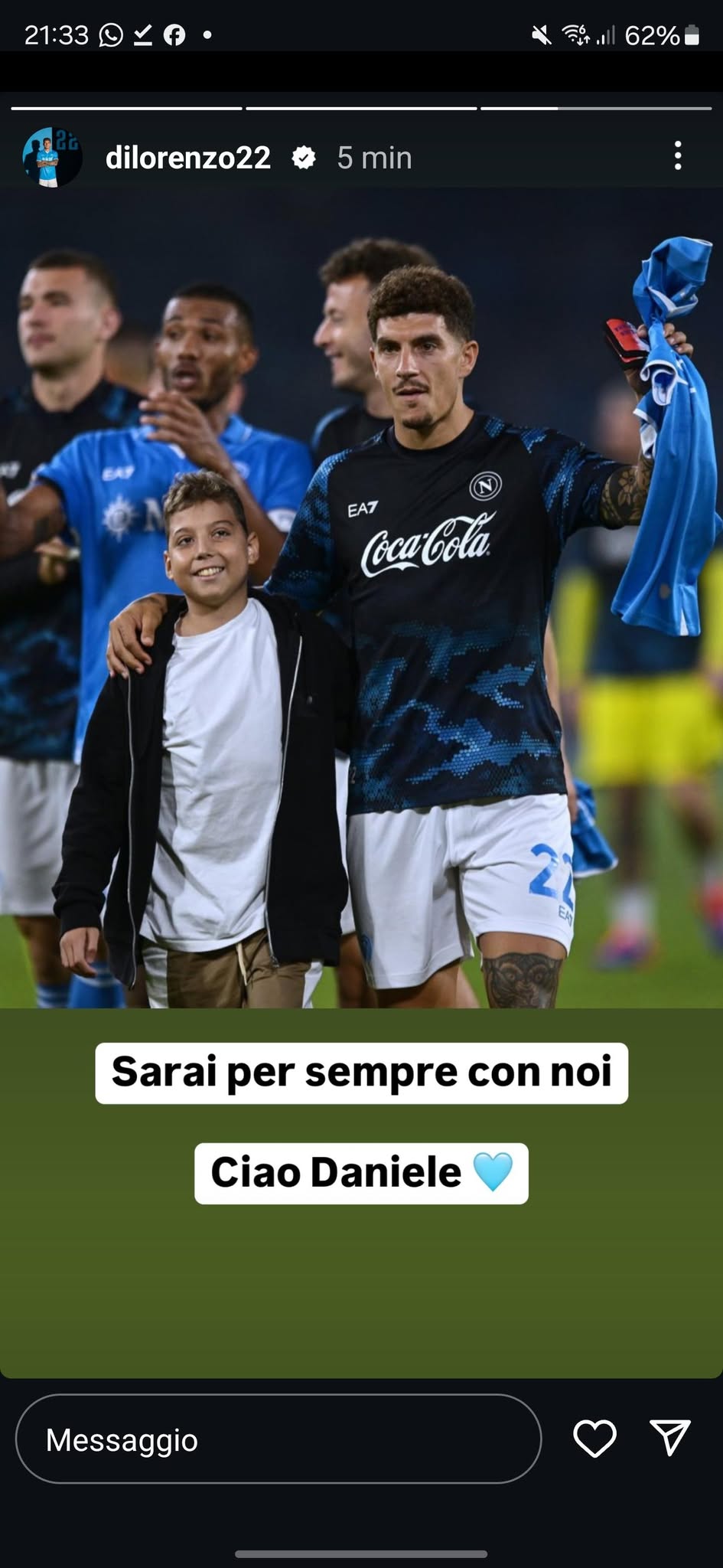 Come tutto il Napoli Calcio, anche il capitano Giovanni Di Lorenzo ha espresso il suo cordoglio sui social per la scomparsa del piccolo tifoso azzurro Daniele. Il terzino azzurro ha postato un 'storia' su Instagram insieme al giovanissimo supporters, scrivendo: "Sarai per sempre con noi. Ciao Daniele".