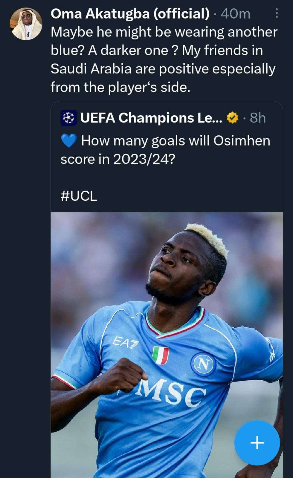 Rispondendo a una domanda posta dalla UEFA Champions League sui social, l'amico-giornalista di Victor Osimhen, Oma Akatugba, sui Twitter si esprime così salvo poi cancellare il suo messaggio: "Forse potrebbe indossare un altro blu? Uno più scuro? I miei amici in Arabia Saudita sono positivi soprattutto dal lato del giocatore".