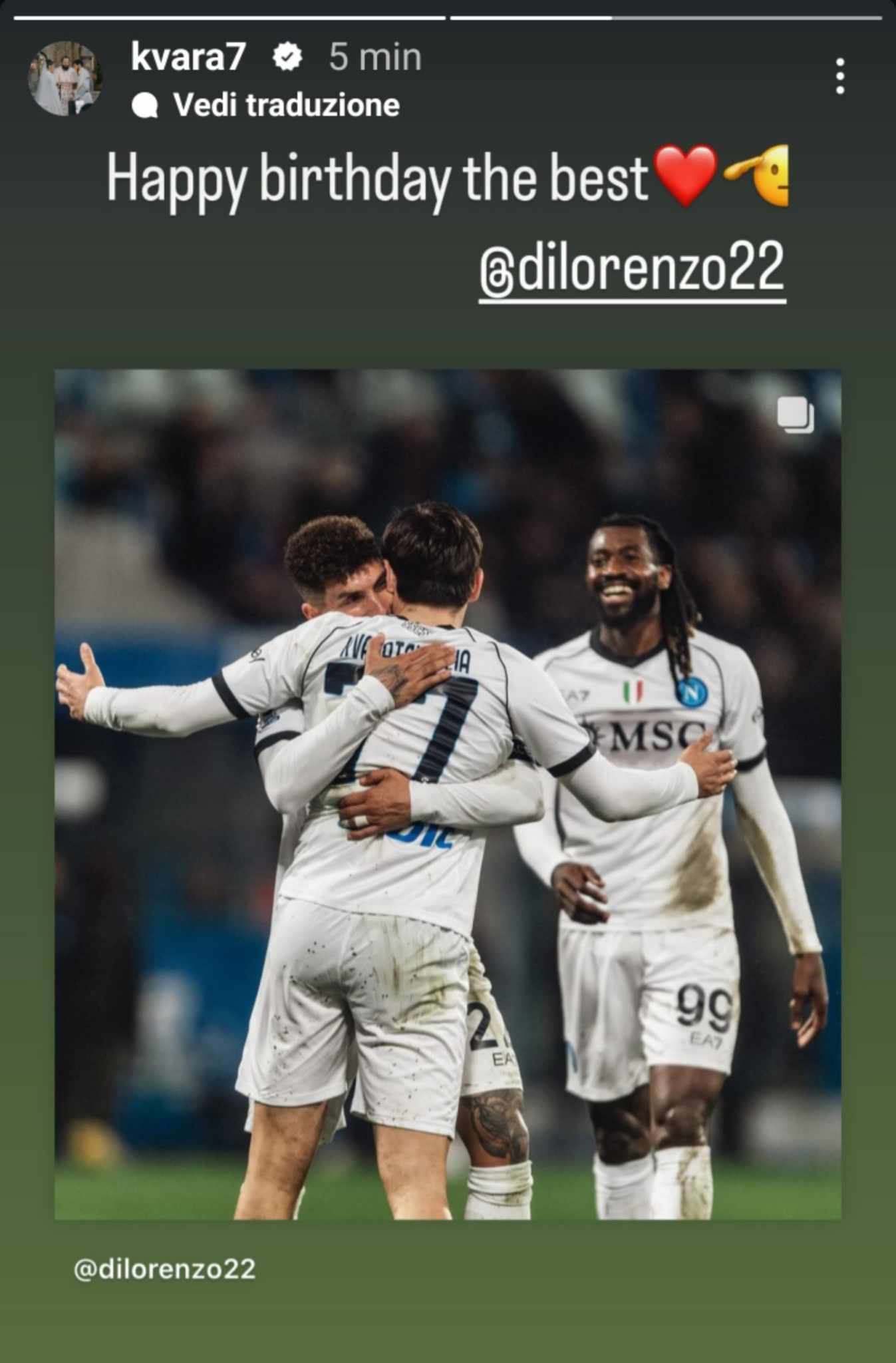 Oggi è il compleanno di Giovanni Di Lorenzo, il capitano del Napoli festeggia 31 anni nel ritiro di Castel di Sangro. Tra i tanti auguri arrivati tramite social al difensore azzurro, ci sono anche quelli del suo compagno di squadra Khvicha Kvaratskhelia. L'attaccante georgiano posta una 'storia' su Instagram, di seguito le immagini.