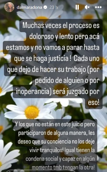 Dalma, la figlia di Diego Armando Maradona, ha commentato il rinvio a giudizio di 8 persone per la morte del Pibe de Oro pubblicando una 'storia' sul proprio profilo Instagram: "Molte volte il processo è doloroso e lento e non ci fermeremo finché non sarà fatta giustizia! Tutti coloro che hanno smesso di fare il proprio lavoro [su richiesta di qualcuno o per inefficenza] saranno giudicati per questo!".