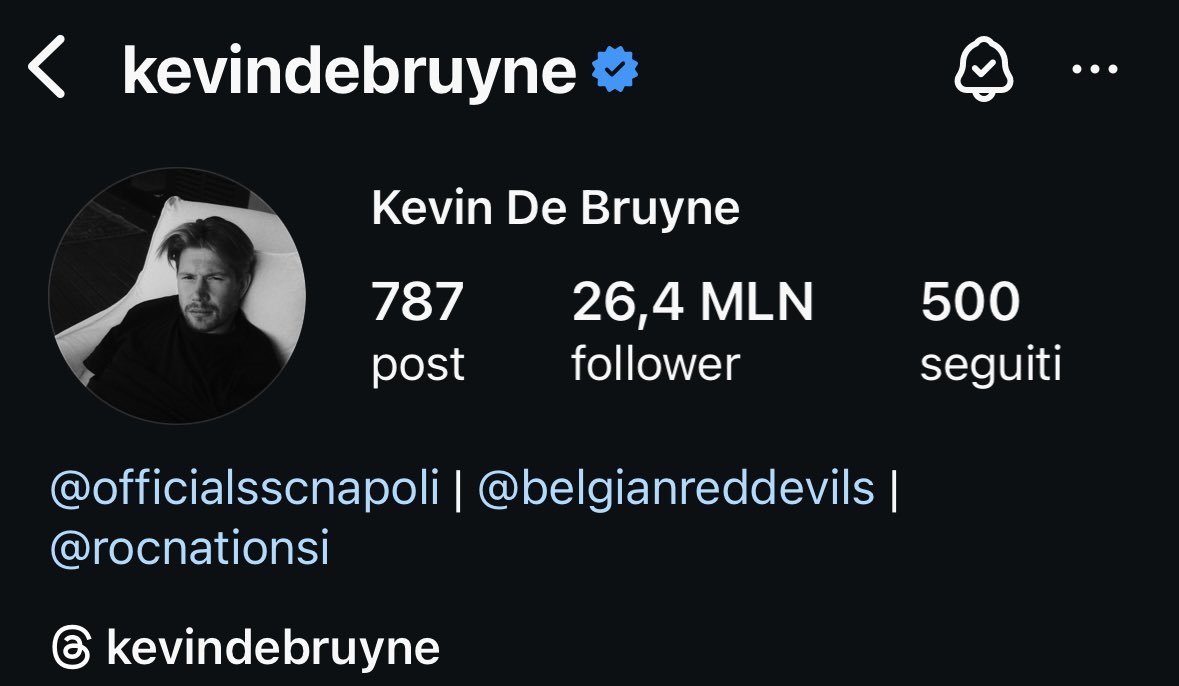 Kevin De Bruyne è stato ufficializzato a giugno come nuovo giocatore azzurro e, poco dopo l'annuncio, il belga aveva aggiunto ai suoi profili social la dicitura "Calciatore del Napoli". Quest'etichetta era sparita poco dopo in favore del ritorno di quella del Manchester City, il che aveva persino spaventato alcuni tifosi. In realtà, era una questione legata al contratto, in quanto De Bruyne sarebbe rimasto di proprietà del club inglese sino al 30 giugno. Oggi 1 luglio, come volevasi dimostrare, De Bruyne ha riaggiunto la dicitura. Di seguito la foto.