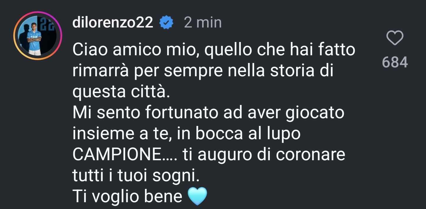 Il capitano del Napoli Giovanni Di Lorenzo saluta Khvicha Kvaratskhelia. E lo fa commentando la spettacolare e commovente clip postata sui social dal georgiano: “Ciao amico mio, quello che hai fatto rimarrà per sempre nella storia di questa città. Mi sento fortunato ad aver giocato insieme a te, in bocca al lupo. CAMPIONE.... ti auguro di coronare tutti i tuoi sogni. Ti voglio bene”.