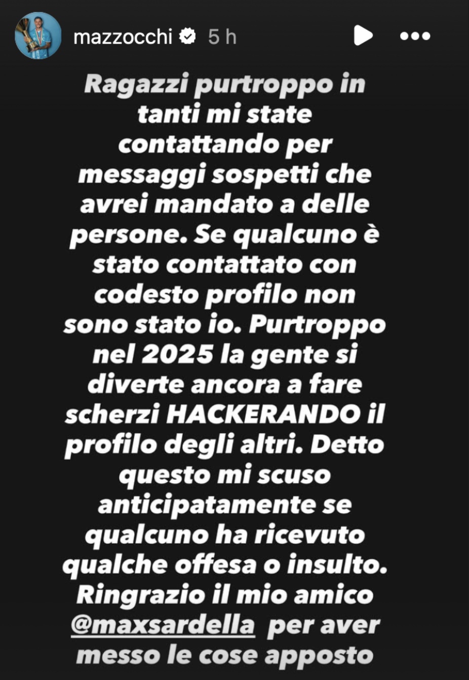 “Ragazzi purtroppo in tanti mi state contattando per messaggi sospetti che avrei mandato a delle persone. Se qualcuno è stato contattato con codesto profilo non sono stato io". Inizia così il messaggio postato su Instagram da Pasquale Mazzocchi, vittima di una disavventura social in queste ultime ore.