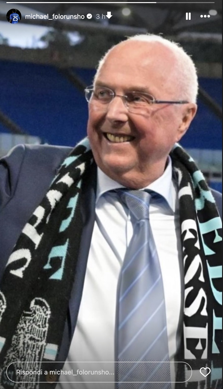 Anche Micheal Folorunsho ricorda Sven Goran Eriksson, iconico allenatore che si è spento oggi all'età di 76 anni, a causa di un cancro al pancreas che da tempo lo tormentava. Il centrocampista del Napoli lo ha commemorato con una story sul suo profilo Instagram. Di seguito la foto