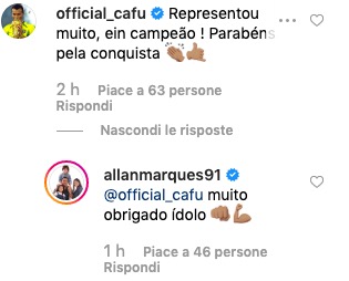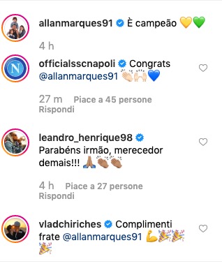 Attraverso il suo profilo Instagram, il centrocampista azzurro Allan festeggia la vittoria della Copa America con il suo Brasile. Ieri il ct Tite, sul rassicurante punteggio di 3-1 dopo un rigore finale, ha concesso gli ultimi minuti di gioco in campo al mediano azzurro nella finale contro il Perù. Il calciatore ha pubblicato su Instagram la foto con la coppa, ricevendo i complimenti di tanti compagni. Anche il Napoli, attraverso il suo account, ha fatto i complimenti al ragazzo. Tra i primi commenti anche quelli del compagno di squadra in azzurro Vlad Chiriches e dell’ex capitano del Brasile Cafu che Allan ha ringraziato definendolo “Idolo”.