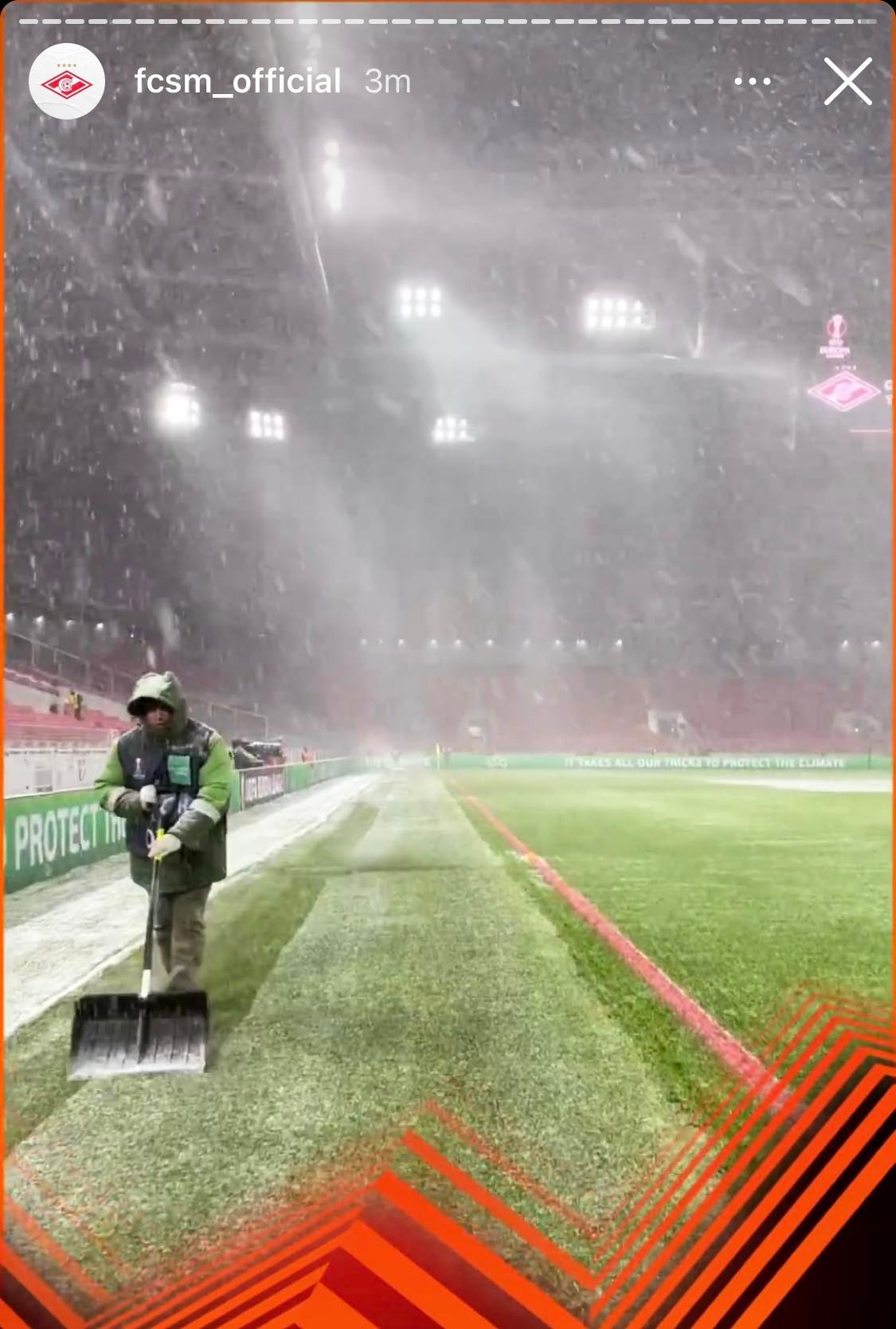 Nevica, nevica sempre di più a Mosca. Quasi una bufera. A poche ore dalla sfida tra Napoli e Spartak, nella capitale russa le temperature scendono sempre più e allo stadio gli operatori sono già al lavoro per spalare la neve dal manto erboso e permettere la normale disputa del match. Di seguito lo scatto pubblicato dallo Spartak su Instagram.