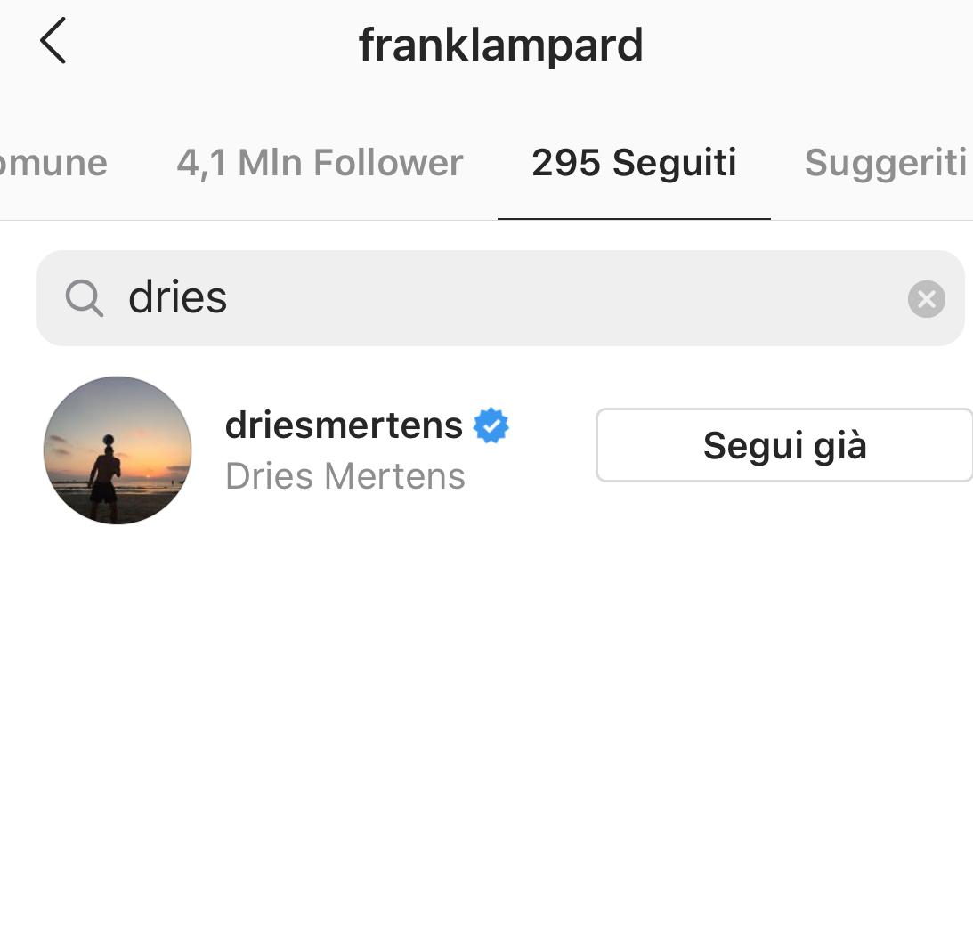 UN PICCOLO INDIZIO - Nel frattempo dai social arriva un piccolo segnale: proprio il tecnico dei Blues Frank Lampard segue il belga su Instagram. Tra i 295 'seguiti' del tecnico inglese c'è proprio Dries Mertens