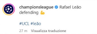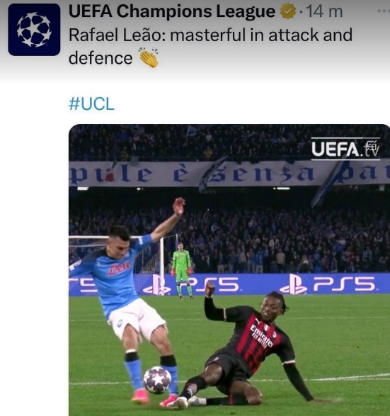 Incredibile ma vero: il fallo da rigore di Leao su Lozano non sanzionato dal arbitro Marciniak e dal Var in Napoli-Milan è stato addirittura celebrato dalla UEFA. "Rafael Leao defending". La difesa di Rafael Leao. "Leao masterful in attack and defense", Leao magistrale in attacco e difesa, queste erano le didascalie di un post con tanto di video pubblicato sugli account social ufficiali della UEFA Champions League. Il post, però, anche a seguito del grande disappunto dei tifosi napoletani e dall'enorme massa di commenti negativi, è stato rimosso dai social dalla UEFA.