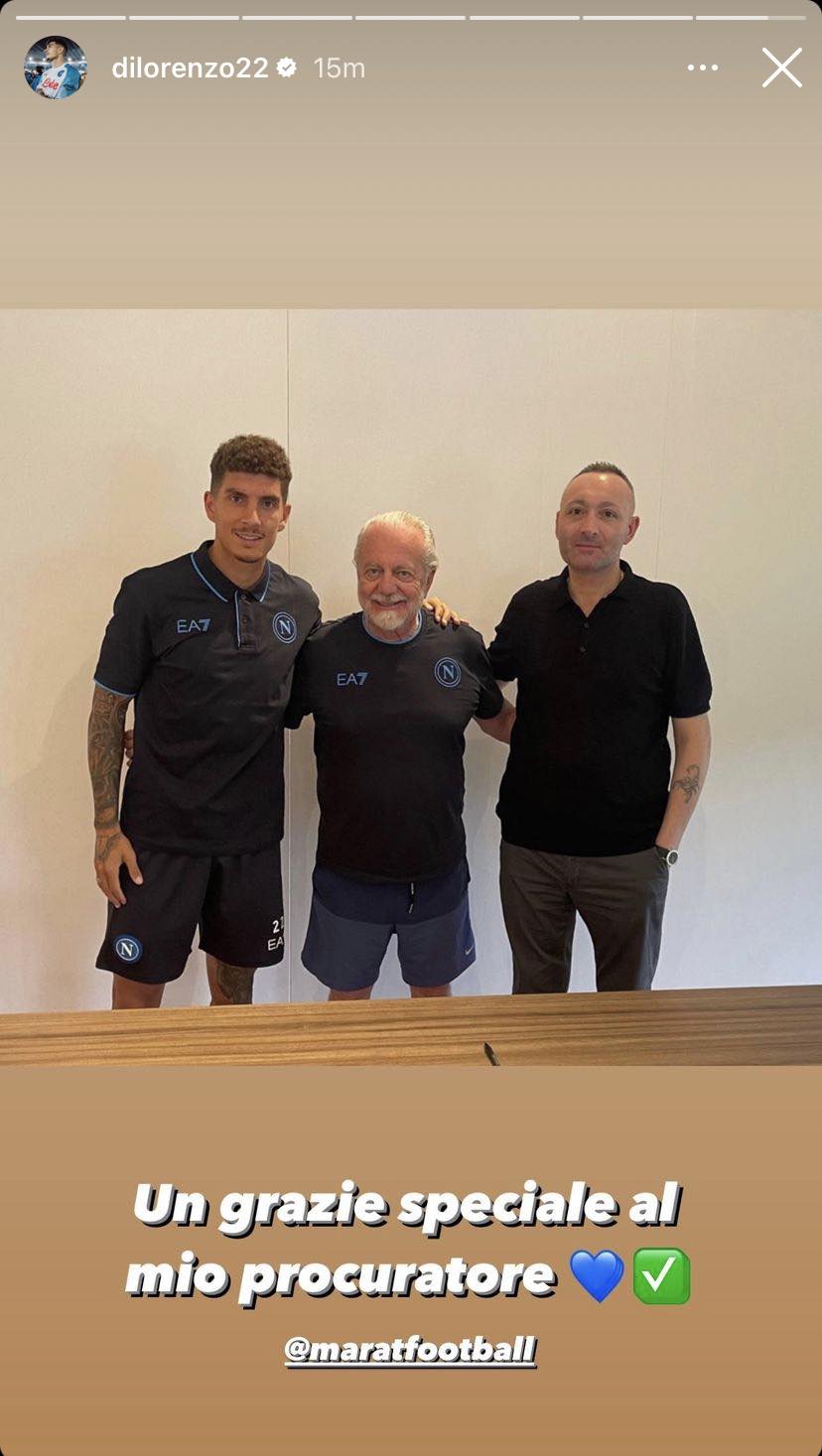 Giovanni Di Lorenzo si è legato al Napoli fino al 2028. Il capitano del Napoli ha postato la foto delal firma del prolungamento del contratto con il club azzurro. Nello scatto insieme al terzino, il presidente Aurelio De Laurentiis e il suo agente Mario Giuffredi. Quest'ultimo è stato ringraziato dallo stesso Di Lorenzo con un didascalia. Di seguito lo scatto.