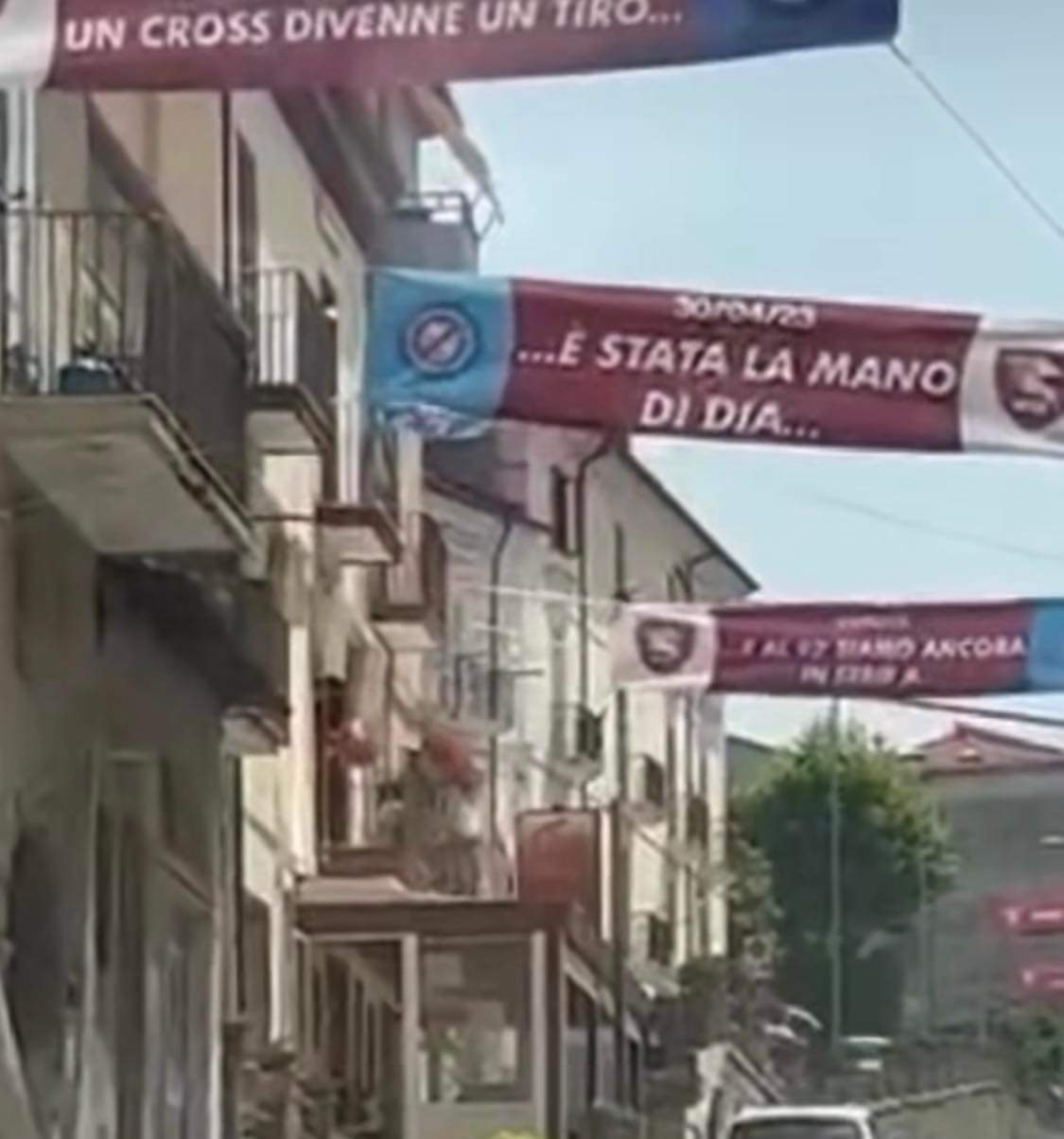 Il gol dell’1-1 segnato all’84’ da Boulaye Dia nel match tra Napoli e Salernitana dello scorso 30 aprile rinviò la festa scudetto degli azzurri. A Salerno si è festeggiato tanto per la rete dell’attaccante senegalese tanto che in città sono stati esposti diversi striscioni di sfottò dal titolo “E’ stata la mano di Dia”. Di seguito le immagini.