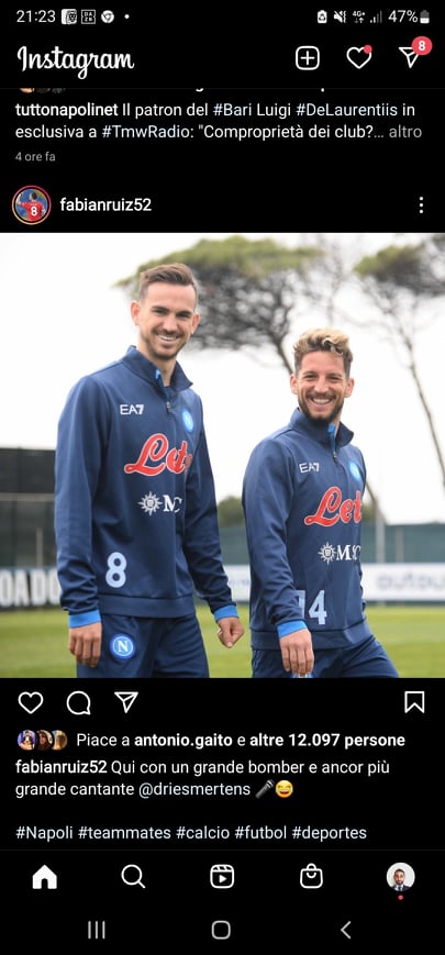 Dopo la performance canora di Dries Mertens al 26esimo compleanno di Fabian Ruiz, lo spagnolo scherza sul campo di allenamento insieme al compagno di squadra. Il centrocampista del Napoli, postando su Instagram una foto insieme all'attaccante azzurro, scrive: "Qui con un grande bomber e ancor più grande cantante".