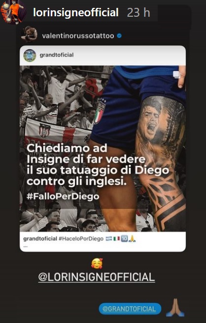 A poche ore dalla finale di Euro 2020 tra l'Italia e l'Inghilterra è impossibile non pensare anche a Maradona per la rivalità con gli inglesi, soprattutto considerando che Lorenzo Insigne, numero 10 della Nazionale, ha tatuato sulla gamba sinistra il volto del Pibe de Oro. Per questo motivo i tifosi napoletani chiedono a gran voce al capitano del Napoli di mostrare il tatoo agli inglesi durante un'esultanza, facendo diventare virale l'hastag #FalloperDiego. Lorenzo ha apprezzato condividendo su Instagram l'appello lanciato dal popolo dei social.