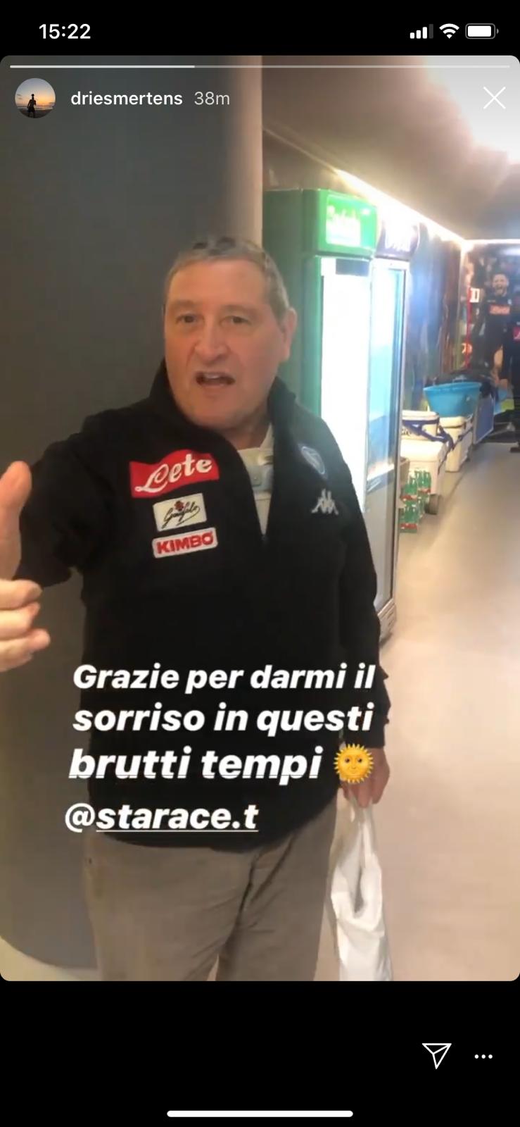 Direttamente dal suo profilo Instagram l'attaccante del Napoli, Dries Mertens ha voluto mandare un messaggio per il rientro a Castel Volturno di Tommaso Starace, storico magazziniere della squadra azzurra che è stato lontano dai campi per un incidente: "Grazie perchè mi dai sorrisi in questi brutti momenti".