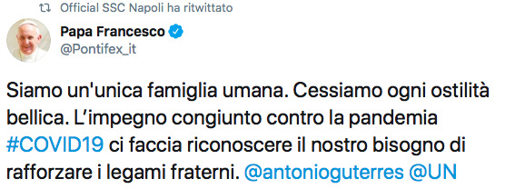 In un momento così delicato per il mondo intero per via dell'emergenza Coronavirus, Papa Francesco ha lanciato un bellissimo messaggio di unione dal proprio account Twitter "Siamo un'unica famiglia umana. Cessiamo ogni ostilità bellica. L’impegno congiunto contro la pandemia COVID19 ci faccia riconoscere il nostro bisogno di rafforzare i legami fraterni". Il Napoli ha ritwittato il messaggio. Di seguito la foto: