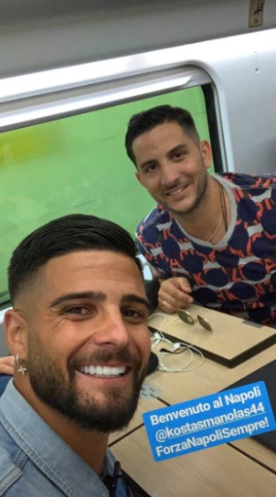 "Benvenuto al Napoli Kostas Manolas". Così sui Instagram Lorenzo Insigne che pubblica una foto con il nuovo acquisto azzurro. I due sono in viaggio per raggiungere Dimaro. Manolas ha sostenuto oggi le visite mediche a Villa Sturart ed è stato annunciato come nuovo acquisto dal Napoli.